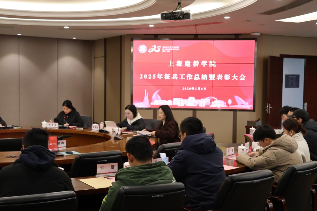 为深入贯彻国家征兵工作部署,全面总结 2025 年征兵工作成效,表彰先进典型,凝聚全校共识,进一步动员广大师生关心支持国防和军队建设,1 月 6 日上午 9 时,上海建桥学院 2025 年征兵工作总结暨表彰大会在行政楼 M612 隆重召开。校长助理、学生处处长、武装部部长张巍教授,学生处副处长、武装部副部长方梦瑶,各二级学院党委(党总支)副书记及征兵工作负责人出席会议。