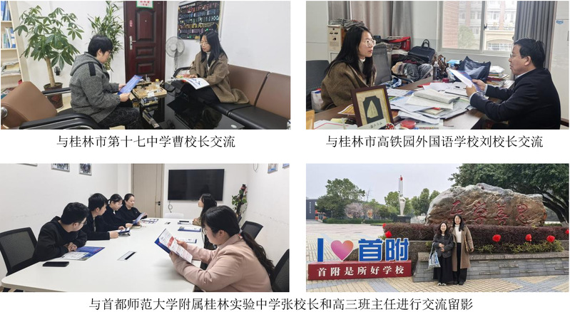 3月16日,工作组先后走访桂林市第十七中学、桂林市高铁园外国语学校、首都师范大学附属桂林实验中学,并受邀参加桂林市部分中学校长交流会,与桂林市考试院及7所中学领导深入座谈,全面了解各校生源结构与升学需求。
