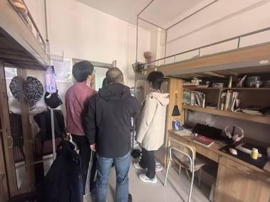 走访过程中,学院领导对各宿舍的用电安全与环境卫生情况进行了细致检查,并与同学们围绕学业发展、生活需求等话题进行了亲切交流。在安全保障方面,朱玉院长在北六-117宿舍表扬了同学们良好的卫生和学习氛围,并着重对充电宝、大功率电器等用电安全作出警示。对学业帮扶、互助创新等方面与学生开展深入交流,鼓励学生建设“创新先锋型”模范宿舍。