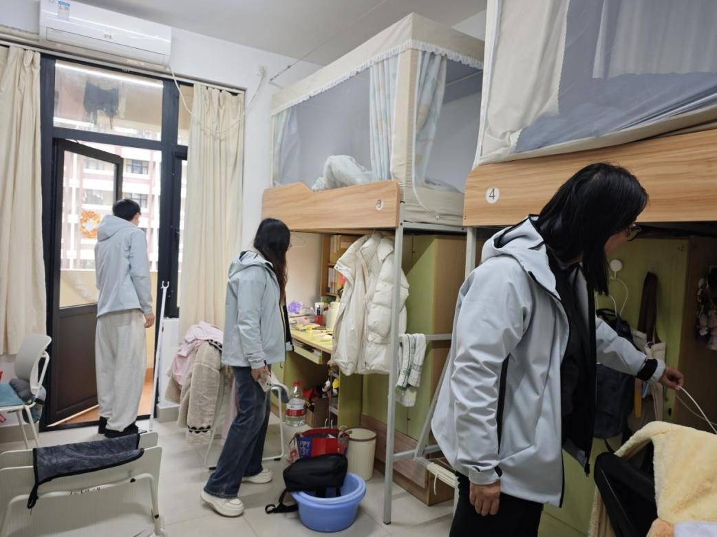 本次安全专项排查严格遵循“全面覆盖、不留死角、逐间核查、闭环管理”的工作原则,聚焦学生社区安全关键环节和薄弱点位,重点围绕消防安全、用电安全、阳台堆物、公共区域秩序、宿舍内务卫生等五大方面开展逐项细致核查。排查过程中,坚持“边排查、边提醒、边整改、边教育”,重点检查宿舍内是否存放违章电器、私拉乱接电线等违规行为,阳台是否堆放易燃易爆物品,同时对学生宿舍内务整理、文明住宿、晚归管理等情况进行全面检查,做到排查无盲区、无遗漏。党委副书记俞海燕在排查现场强调,学生社区是育人重要阵地,更是学生在校期间学习生活的核心场所,安全底线不容有失、不可逾越。