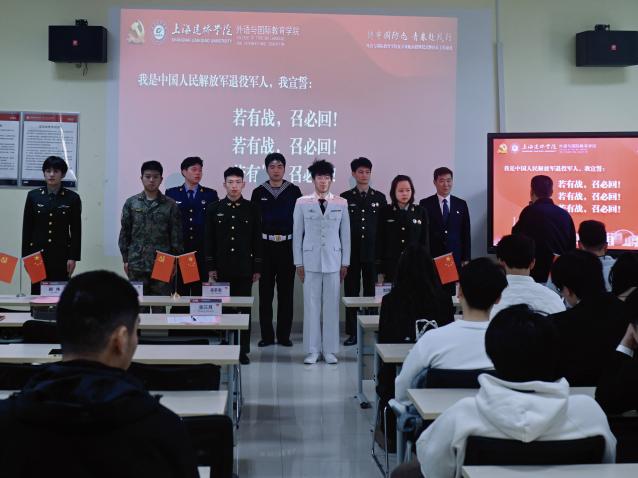 大会首项议程是榜样引领环节。优秀退役大学生士兵李浩然以质朴的语言分享了自己的军旅故事,从初入军营时的迷茫到执行任务时的坚定,生动诠释了“从校园到军营”的蜕变历程,为在场学子树立了鲜活的学习标杆。在他的感召下,全体退役大学生士兵代表上台,在赵磊老师领誓下庄严宣誓:“若有战,召必回!”铮铮誓言不仅彰显了退役士兵对祖国的忠诚,更将现场气氛推向高潮,极大地激发了在场青年投身国防的决心与热血。