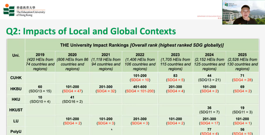 熊教授指出,香港高校在SDGs教育方面形成了较为成熟的协作机制,如香港可持续校园联盟(HKSCC),但在资源配置、课程深度与能力培养方面仍面临进一步提升空间。他强调,随着国际影响力排名的兴起,高校愈发重视可持续发展议题,但如何将其真正融入教学与科研、推动能力本位的教育转型,是未来发展的关键。