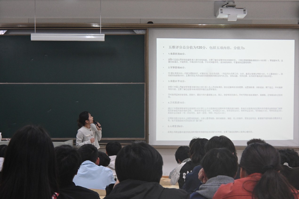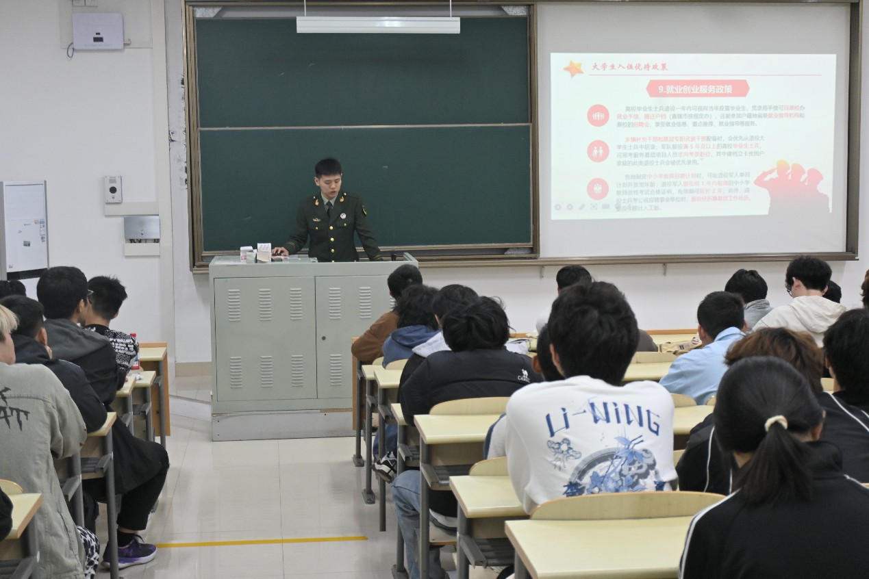 宣讲期间,主讲人围绕征兵工作总体部署、报名流程、政治考核、学籍保留、退役复学等政策进行系统权威解读,确保政策传达准确规范。同时他们结合服役经历,详细讲解征兵体检标准、“五维四型” 定兵标准,重点解读免试专升本、就业扶持、落户优先等激励政策,以真实经历回应学生关切、消除思想顾虑。线下宣讲团队深入各班级面对面交流,线上直播同步答疑互动,耐心解答体检细节、政审要求、学业衔接、军营生活、职业发展等学生普遍关注问题,有效扩大宣传覆盖面,推动征兵政策入脑入心。