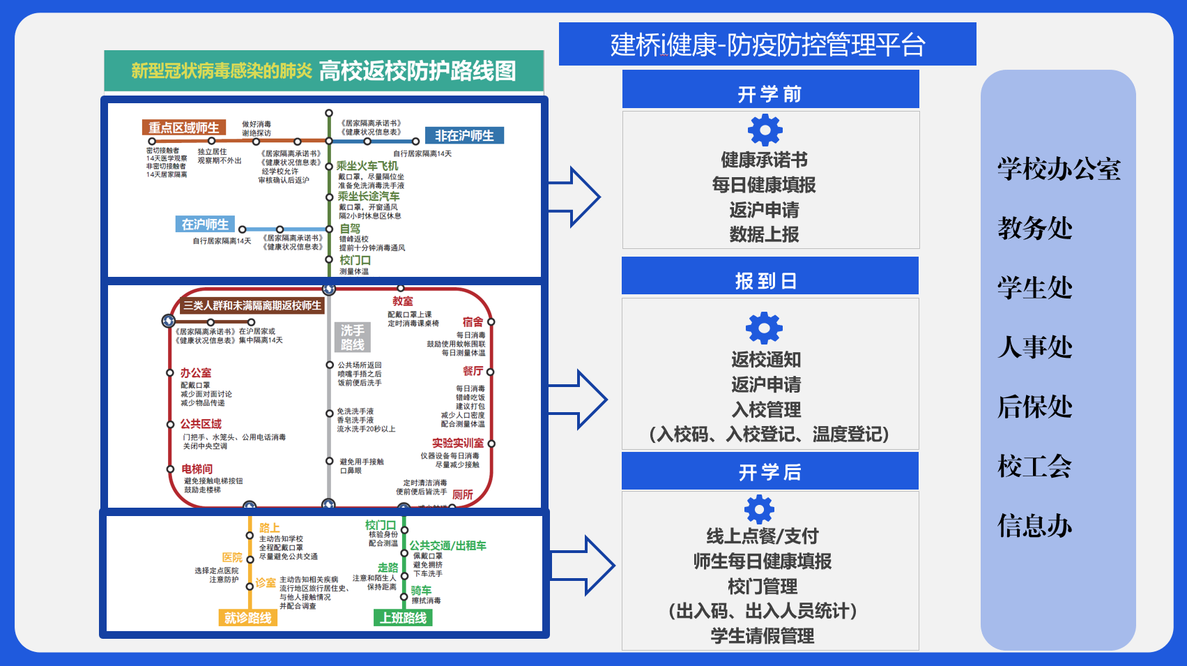 自新冠肺炎疫情发生以来,上海建桥学院认真贯彻落实习近平总书记重要指示精神和党中央决策部署,充分发扬斗争精神,全力守护学校师生的平安健康,全面落实防控措施。全校近两万余名师生的安危时刻让人牵挂。他们身体还好吗?今天在哪里?有没有返沪的师生?返沪住在哪儿?这是每位辅导员们每天都要问三遍的问题。而摆在学校管理层面前的问题还有:防控期间进出校如何控制?如何减少校内人员交叉?留校学生在校生活怎么办,如何随之了解他们的情况?开学方案如何实施,做到一人一登记,在校门口就筑起安全的保护网?困难面前,作为上海市信息化标杆培育校又是上海市后勤协会信息化专委会秘书长单位,学校信息办703工作室主动请缨,联合学工部、教务处、人事处迅速组建了一支协同合作的信息化青年突击队,据市教委后保处要求,在协会信息化专委会、高后中心支持下,紧急开发疫情防控系统。青年突击队积极发挥信息化自主开发能力,依托校级移动端服务平台和pc端管理平台,突击开发完成“建桥i健康”管理系统。并根据上海市教委下发的《上海市高等学校和中等职业学校防控新型冠状病毒肺炎疫情开学指南(试行)》,以落实校园防疫防控措施、提高信息搜集与监测的效率、尽可能
