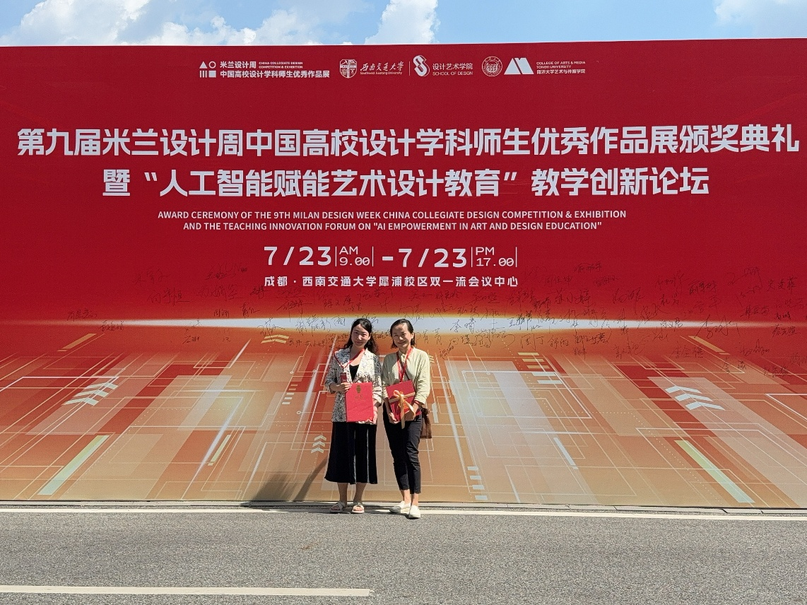 7月22-25日,第九届米兰设计周——中国高校设计学科师生优秀作品展(教育部认证权威赛事)上,建桥艺术设计学院强势突围,一举斩获全国总决赛6项大奖,含一等奖1项、二等奖1项、三等奖4项,并荣膺优秀组织奖。院长助理盛蓝、教师丁易代表学院,在同期举行的聚焦“人工智能赋能艺术设计教育”的全国教学创新论坛中,深度分享“建桥”经验,引领前沿对话。本届盛会以深化AI赋能设计教育为核心议题,汇聚了全国1759所高校的师生力量,共征集作品超27万件,规模创历届之最。该展会作为中国设计学科师生走向国际的重要平台,前八届已累计输送1400余件作品至米兰。在备受瞩目的全国总决赛中,艺术设计学院师生作品从海量参赛项目中脱颖而出,共斩获6项国家级大奖。其中,由刘书辰老师指导、程琪与陈婕创作的《与海共赏——螺钿系列动态海报》勇夺一等奖;由丁易老师指导、吴蔓科创作的《智药伴侣——基于辅助视障人群用药的智能产品设计》荣获二等奖。另有四件作品获三等奖:杜孟琳指导、杜易轩的《绿野生息游戏设计》,尚晓倩老师指导、陈华辰的《时光绘卷——老小区改造人居环境改造设计》,刘书辰老师指导、郭澄陆的《白癜风光疗仪》,以及吴艺华老师指导