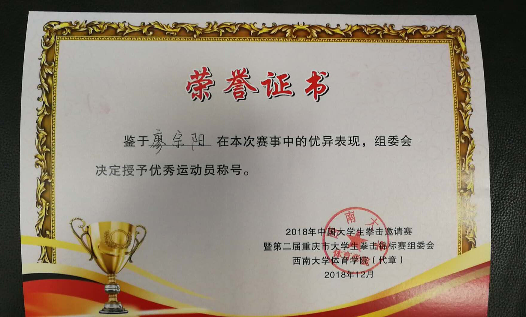 12月17日—21日,2018年全国大学生拳击邀请赛在重庆西南大学举行,来自全国34所高校的219名运动员参加此次大赛。我校共派出四名运动员参加本次比赛,他们分别为高职学院的李世龙(乙组69KG),商学院的刘杨(甲组52KG)、刘明明(甲组64KG)和廖宗阳(甲组58KG)。在体育部主任林恬和教练肖友定老师的带领下,建桥学子在场上敢打敢拼,充分发挥教练布置的技战术水平,奋力为我校荣誉而战。最终,廖宗阳获58公斤级甲组季军,李世龙获69公斤级乙组第五名。此外,廖宗阳同学获优秀运动员奖,上海建桥学院获大会最佳组织奖。赛前学生为比赛集训了3个多月,特别是廖宗阳同学为了出成绩,每天保持两小时以上的训练量,体重更是从64.5KG减到58KG以下。三周共减重13斤,顽强意志!非凡毅力!本次大赛廖宗阳更是不负自己一直以来的努力。在前两场比赛中,面对高大的对手,廖宗阳利用自己灵活多变的特点战胜对手。进入半决赛,廖宗阳在第二局技术击倒对手的情况下,最终以微弱点数输给对手,遗憾错失决赛,获得58公斤级的季军。(廖宗阳第一场比赛集锦)(廖宗阳第二场比赛集锦)(廖宗阳第三场比赛集锦)