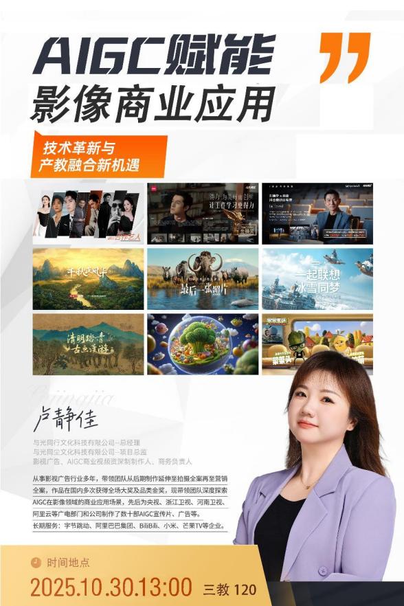 为推进专业教学改革与产教融合深度落地,响应 AIGC 产业发展对人才培养的新要求。2025年10月30日,艺术设计学院数艺专业特别邀请了与光同行文化科技有限公司总经理卢静佳到校,为师生开展主题讲座:AIGC赋能影像商业应用,搭建行业前沿与教学实践的沟通桥梁。卢静佳为影视广告、AIGC商业视频资深制制作人、商务负责人,作品在国内多次获得全场大奖及品类金奖,现带领团队深度探索AIGC在影像领域的商业应用场景,先后为央视、浙江卫视、河南卫视、阿里云等广电部门和公司制作了数十部AIGC宣传片、广告等。讲座中,她以公司中的多项商业项目为案例生动介绍,详细讲解了项目立项、技术选型、团队协作及成果落地的全流程,同时针对学生关注的职业能力需求,强调了 AIGC 工具应用、创意设计与技术融合等核心素养的重要性,AI 辅助影视特效制作不仅提升了效率还降低了成本,成为当下市场中热度最高的商业制作形式,在场师生对行业实际运作有了更清晰的认知。此次讲座亦是推进产教融合的关键环节。交流环节中,卢静佳总经理与专业教师就工作室项目合作细节深入对接,明确将以企业真实项目为依托,在学校共建 AIGC 实践工作室,由企业导