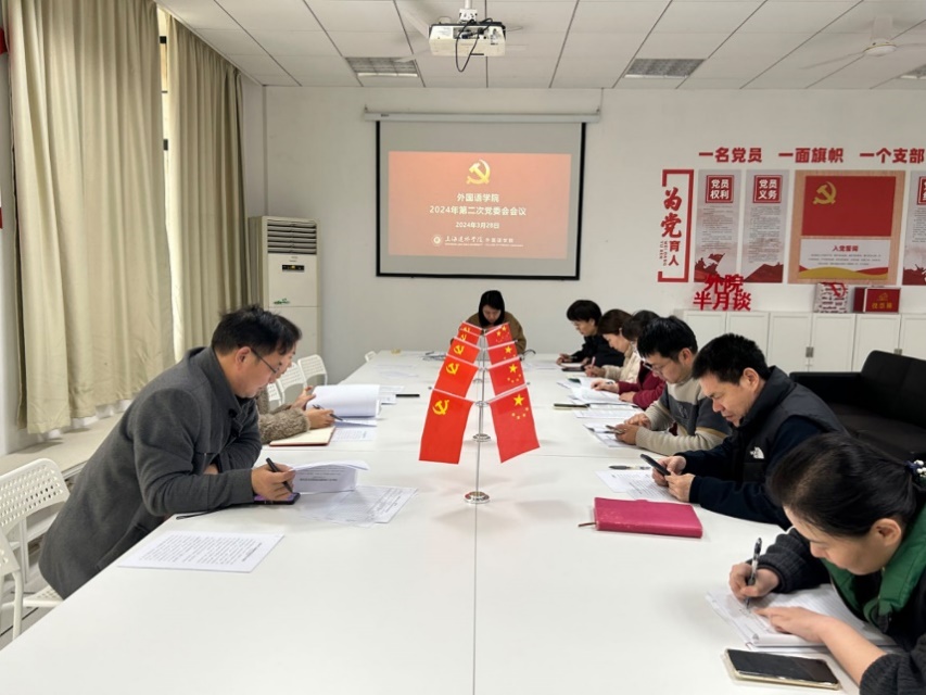 3月28日下午,外国语学院在303会议室召开了第二次党委会会议,全体党委委员出席了本次会议,会议由外国语学院党委书记杜鹃主持。本次会议共有四项议程。首先在第一项议程中,杜书记带领与会同志学习了《中共上海建桥学院委员会2024年工作要点》,杜书记结合文件中的“五个突出”,结合学院党建实际工作,突出如何把党建和业务相互融合。她以“学思想,创青春,学生进社区做小先生”特色项目为例,指出学院如何落实大思政工作;以学院在建的“外院半月谈”为例,探索如何建立健全师德师风常态化教育机制等。随后,杜书记还介绍了《2024年上海建桥学院7+3组织生活安排》,围绕文件要求,提出了相关工作部署,强调各党支部要按照计划落实组织生活,坚持理论联系实际,不要本本主义,在组织生活的生动性、实效性上功夫,坚持学以致用,推动学院党建工作高质量发展。第三项议程中,会议审议了2024年第一季度党员发展情况与预备党员转正工作,经全体党委委员审议与表决,通过了吴忻怡、孔辉,2名同志发展为中共预备党员,通过了胡昕扬、沈嘉怡、黄思宁,3名同志按期转为中共正式党员。会议最后,杜鹃书记强调要强化政治引领,坚持为党育人、为国育才,落实立