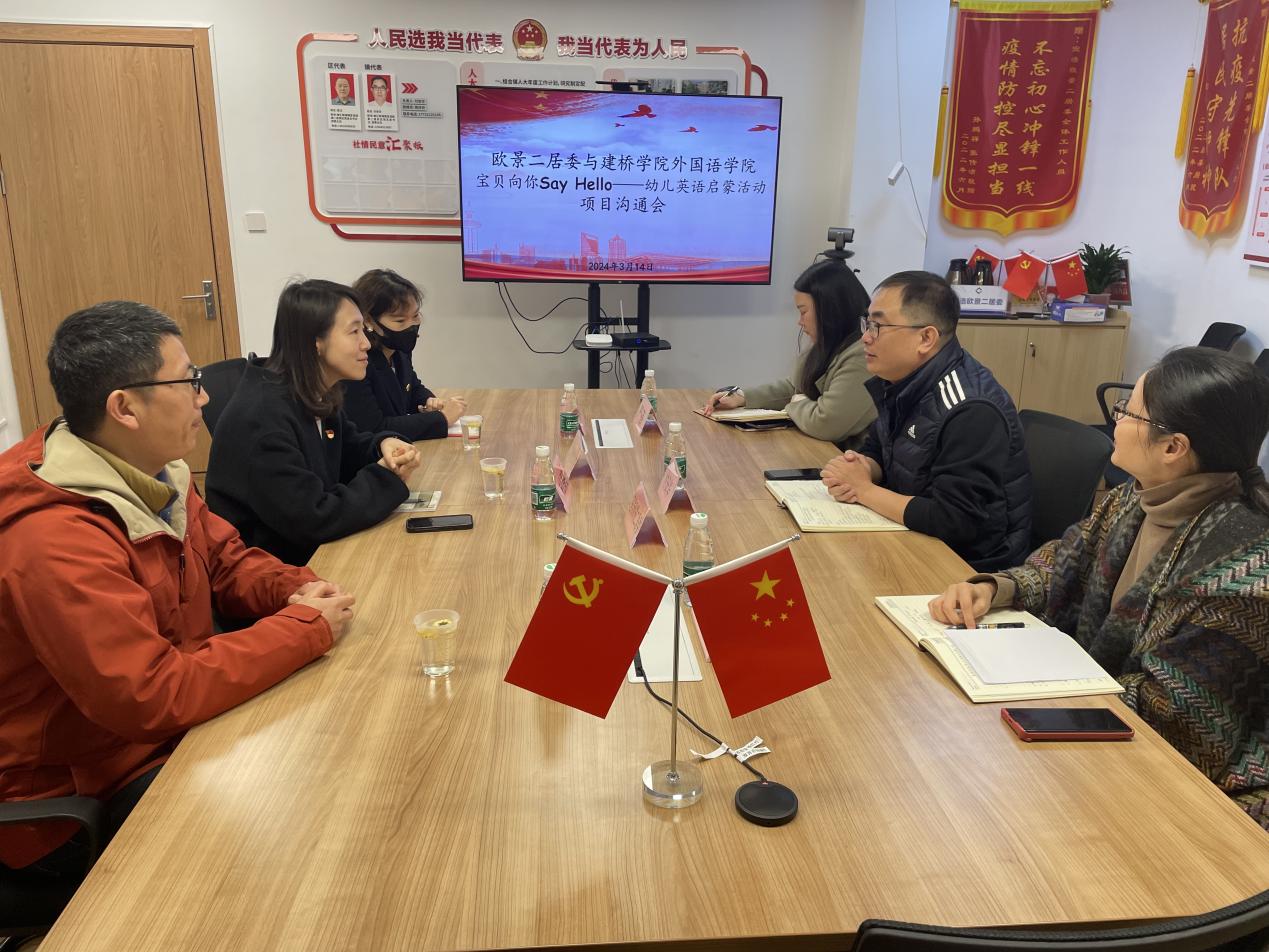 2024年 3月21日,外国语学院党委书记杜鹃、英语系主任林安洪、组织员刘沛雨赴南汇新城镇申港社区宜浩欧景,与宜浩欧景二居委党支部书记付安华,居委副主任赵彩红等同志就“学思想创青春,助力社区新发展”院社共建活动进行进一步洽谈。会议伊始,宜浩欧景二居委付安华书记对外国语学院领导和老师们的到来表示热烈的欢迎,并表示外国语学院在社区开展的两期幼儿英语启蒙活动都已圆满结束,学院志愿者队伍展现了当代大学生的风采,认真的工作态度也得到了居民的高度认可,为社区的小朋友们提供了一个学习交流的平台,也在寓教于乐的氛围中促进了儿童的健康成长。为不断增强社区居民的幸福感和满意度,居委工作者也汇集了居民的建议和意见,希望学院结合居民需求不断优化教课方案。随后,杜书记感谢宜浩欧景二居委为我们学生提供了丰富的实践平台以及高度认可,并表示学院会以常态化开展和精准化服务相结合的思路,进一步深化“院社共建”的实践育人理念,持续培育和引导英语教育专业的“小先生”们,强化合作交流,形成发展合力。会上,双方还就课程优化、合作模式、实践基地的打造等问题进行了深入交流,促进了院社合作的持续深入发展。院社共建聚合力,共融共享促发展