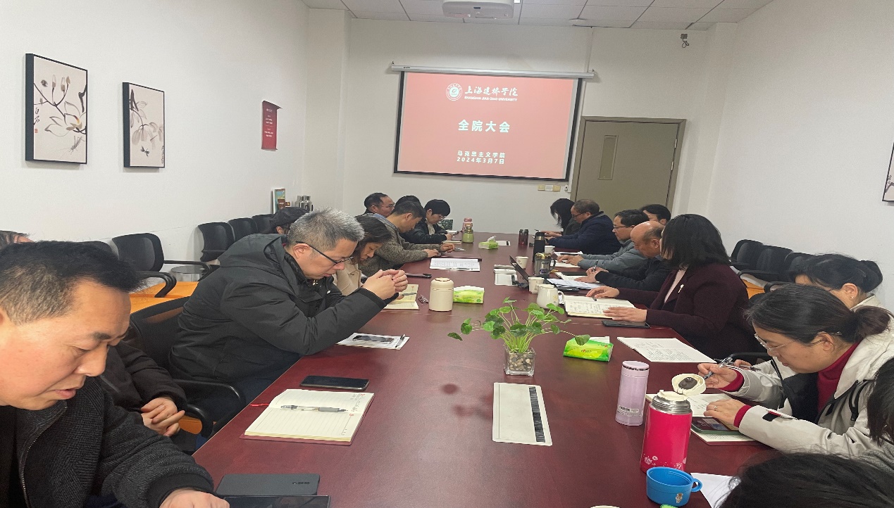 2024年3月7日,马克思主义学院召开新学期工作布置会。马院院长宋艳华主持工作会议。马院党总支书记胡家俊传达了《教育部关于印发新时代高校思想政治理论课行为规范和准则的通知》,布置了马院如何贯彻执行的工作计划。胡书记强调全体党员要吃透精神,自觉行动,坚守底线,站好思政课讲台。宋艳华介绍了学校党委书记杨伟人来马院调研的基本情况,要求全体教师要振奋精神,按照学校党委对马院建设要求全力做好学院各项工作。宋艳华具体布置了本学期几项重点工作。一是以思政课教师行为规范和准则为基本要求,做好师德师风建设,激发教师工作积极性;二是深化课程建设与教学改革,提高思政课教学与科研水平。继续探索大思政课方式方法,推进大中小一体化建设;三是推进师资队伍建设,全力以赴完成招聘任务。马院副院长沈树永传达了学校教学工作会议精神,就开学第一周马院教学情况做了分析,要求教师要精心备课,提高课堂教学质量,管好课堂纪律。沈树永就做好本科审核评估迎评工作,从重要意义、评估标准、具体要求等方面作了仔细解读,要求全体教师做好充分准备,保质保量做好审核评估工作。