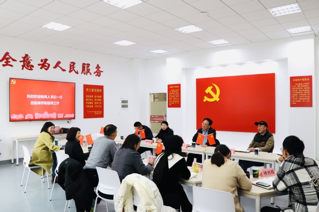 3月6日上午,校党委书记杨伟人、人事组织处处长张宁、党委组织部副部长黄晓星、宣传部副部长桑正一行莅临商学院指导工作。商学院党委书记刘爱香、院长高健、副院长尹卫华以及学院党委委员陪同出席。商学院党委书记刘爱香就学院基本情况和党委工作情况作简要汇报。刘爱香书记在汇报中首先简单介绍了学院的基本情况,包括学院的组织架构、专业介绍、师资力量和人才培养等。接着重点介绍了学院党委的工作情况,包括党建体制机制、党委组织机构、党建工作阵地、党员培养发展、党员教育管理、师德师风建设、课程思政建设、党建课题研究等。刘爱香书记在汇报中指出,商学院党委以党的政治建设为统领,确保党组织领导和运行机制到位;以党的思想建设为导向,确保政治把关到位;以党的作风建设为抓手,确保思想政治工作到位;以党的组织建设为根本,确保基层组织制度执行到位;以党的制度建设为关键,确保党建工作与事业发展融合到位。刘爱香书记表示,商学院党委在上海市教委、民办党工委、校党委的领导和支持下不断发挥党委的政治核心作用,取