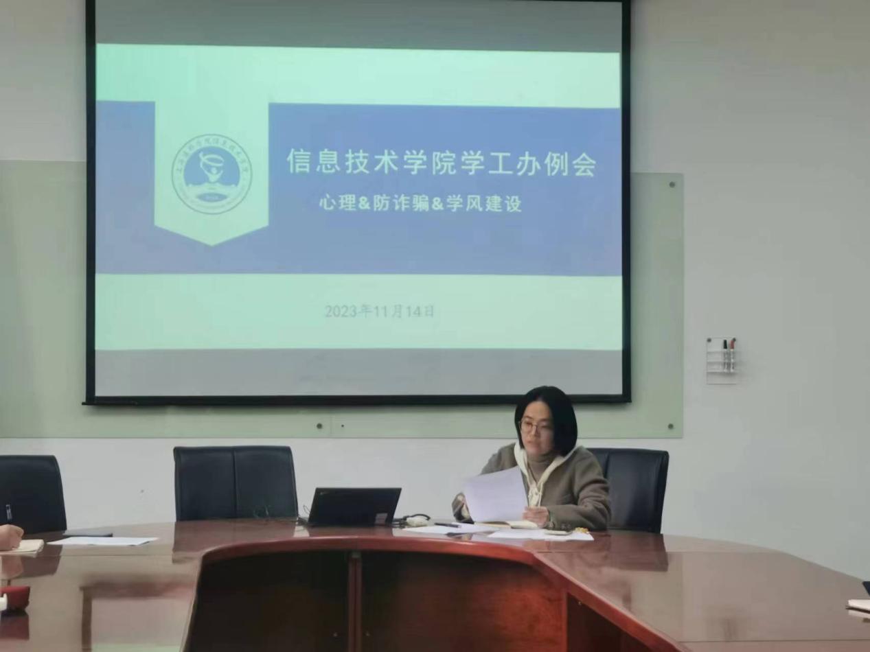 11月14日上午10时,信息技术学院学工团队在学院205会议室召开辅导员专题例会,学院党委副书记徐娜及全体辅导员与会,此次例会内容涉及心理危机防范、防诈骗个案研讨、学风建设研讨三方面内容。会议伊始,徐娜副书记邀请学院心理横向负责人李苗老师就心理危机个案和大家进行了研讨交流,再次详细讲解了突发事件的“四步走”处理流程。通过交流,老师们一致认为要继续将对学生的关爱融入日常,做细做实。接着,徐娜副书记带领团队就电信诈骗的典型案例进行了研讨交流,内容主要涉及网购商品类诈骗、买卖游戏账号诈骗、冒充微博好友诈骗、网络贷款诈骗四方面。老师们纷纷表示将继续加大防诈骗工作工作的宣传力度,提升学生的安全防范意识,保护学生的人身财产安全。最后,徐书记就2023年学风节的工作重点进行了部署要求,重点讨论成立学风节工作小组,并对相关工作计划进行了详细安排。