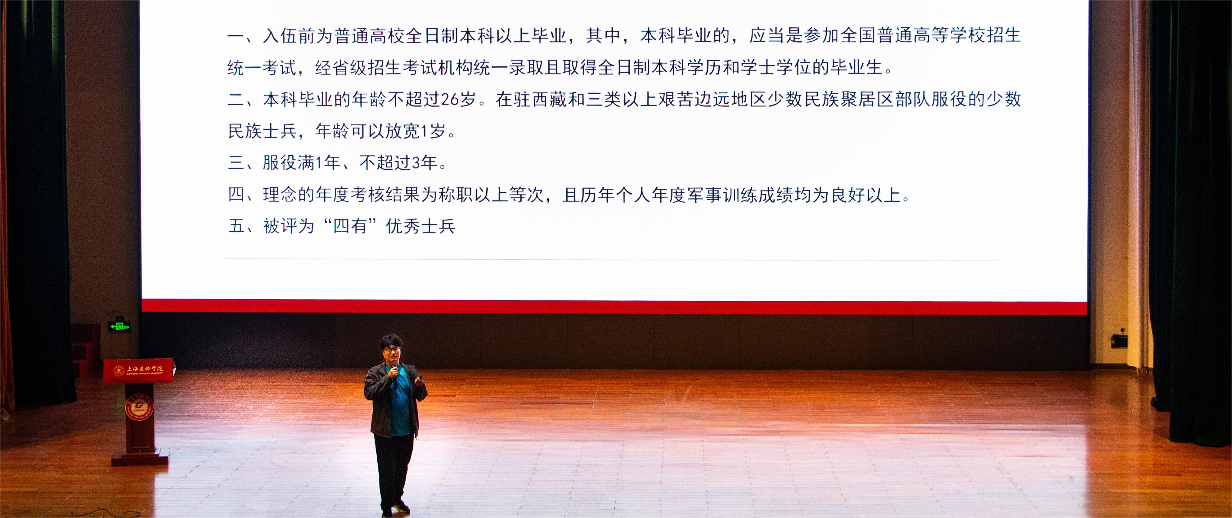 为落实学校在2023年度征兵总结报告会上的部署安排,机电学院于10月26日在大礼堂举办了面向全体大四毕业班学生的征兵政策宣传会,学院征兵负责老师马世超担任本次宣传会的主讲人,全体2020级毕业生和辅导员参加。马世超老师从应征入伍的基本条件、优惠政策、发展路径和征集流程等四个方面,向全体毕业班学生全面地讲述了上海市的征兵政策,并且就上海市征兵优惠政策做了重点介绍。本次征兵宣传会使毕业班学生充分了解上海市征兵的各项政策和流程,激发了他们的参军热情,为本院开展2024年春季征兵奠定良好基础。