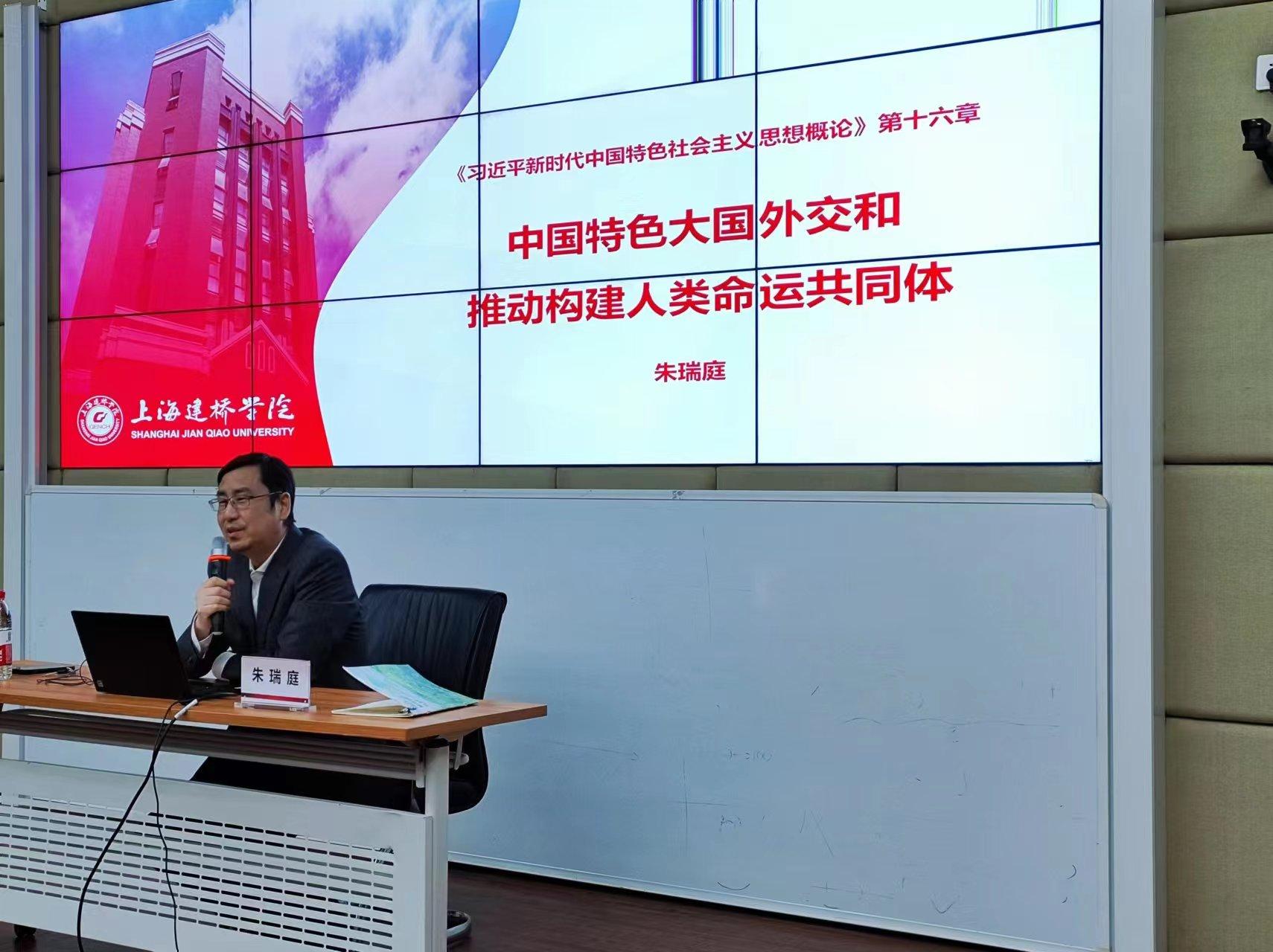 2023年10月11日晚,校长朱瑞庭教授在三教222教室为我校学生讲授《习近平新时代中国特色社会主义思想概论》第十六章《中国特色大国外交和推动构建人类命运共同体》课程,马克思主义学院副院长沈树永主持此次授课。朱瑞庭校长首先向学生传达开设《习近平新时代中国特色社会主义思想概论》课的必要性和重要性,就为什么学习、如何学习习近平新时代中国特色社会主义思想,同学生认真开展了交流对话。朱瑞庭校长指出,学深悟透习近平新时代中国特色社会主义思想,要把握这一重要思想的世界观、方法论和贯穿其中的立场观点方法,在学习科学知识、培育科学精神、掌握思维方法过程中体悟习近平新时代中国特色社会主义思想的真理力量。朱瑞庭校长从“世界怎么了”“人类向何处去”“中国怎么办”“一带一路:中国智慧、大国担当”四个方面展开具体阐述。课程以构建人类命运共同体为主题,聚焦时代之问、世界之问和人类之问,首先对世界百年未有之大变局作出全景式呈现,回答世界怎么了,接着讲述构建人类命运共同体的理论依据、丰富内涵和实践要求,这是中国为解决人类社会普遍问题贡献的“中国方案”,最后重点介绍共建“一带一路”倡议是构建人类命运共同体的生动实践。今