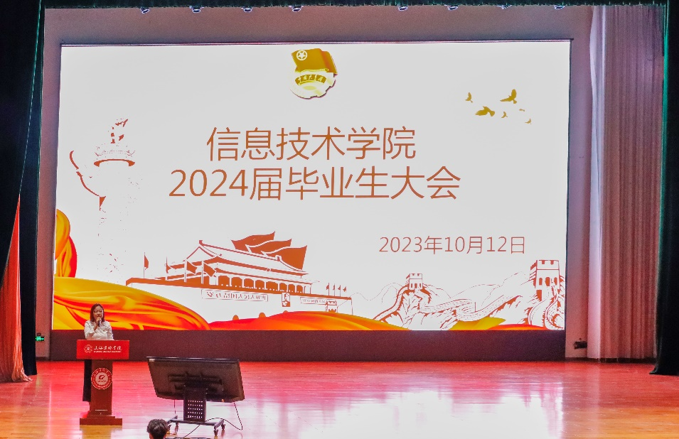 2023年10月12日,信息技术学院于大礼堂顺利召开了2024届毕业生大会。出席本次大会的领导老师有院党委书记王晨岑、院党委副书记徐娜、教学副院长矫桂娥、2020级全体辅导员和全体毕业生,大会由院党委书记王晨岑主持。王书记勉励同学们要做到以下三点:一要坚定爱国报国的奋斗情怀,把自身发展和民族复兴相结合;二要坚守道德修为的奋斗境界,无论何时何地,无论正在做什么和将要做什么,要坚守对真善美的执着追求;三要坚持笃行笃学的奋斗追求,学用结合,大胆实践,将真才实学在干事创业的实践中尽情挥洒,以笃行笃学的追求在奋斗道路上乘风破浪,扬帆远航。接着,矫桂娥副院长对2024届大四学年的教学安排进行了详细解读,强调了专业培养计划,专业课程、计算机证书,以及毕业设计和重修等方面的注意事项。矫院长还针对学籍异动情况以及学位授予条件等具体问题进行了深入剖析,呼吁毕业生们认真对待这些问题。随后,徐娜副书记就毕业生安全教育与就业工作提要求,勉励同学们调整好就业心态,树立正确的择业观,同时学院将会以保毕业稳就业为原则,进一步为毕业生们做好全方位的指导和服务。伴随着热烈的掌声,2024届毕业生大会圆满落下帷幕。此次大会