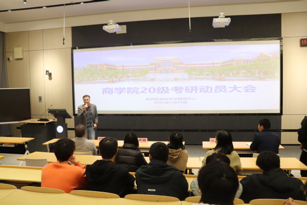 Normal07.8 磅02falsefalsefalseEN-USZH-CNX-NONE3月15日下午,商学院2020级考研动员大会在三教220教室成功举办。大会邀请了常健聪教授作为主讲人,商学院院长高健、20级辅导员和20级意向考研的学生参加,商学院考证考研指导中心负责人陆军主持。首先,陆军介绍了商学院2022年学生考研被录取的情况,总结了2022年考研帮扶工作。接着,高健院长分析了当前的考研形势,提出一些有针对性的考研建议。他表示,学院会全力以赴帮助同学们备战考研,为有考研需求的同学提供相关服务,帮助同学们实现自己的目标,最终取得理想的成绩。紧接着,常健聪教授作为上海海洋大学、上海电机学院、江西财经大学三所大学的研究生导师,他从导师的视角向在座同学客观、详细地介绍了考研的相关信息。常健聪对近些年考研的宏观趋势进行分析,其中着重对近几年来考研人数、招考方向以及扎堆现象的两极分化情况进行了利弊分析,又结合上海考研的情况和相关考研案例,为同学们提供考研指导,提出意见和建议。本次考研动员会的召开,不仅让同学们对现在的考研形势有了进一步的认识和了解,同时还激发了同学们的考研热情,学习热情,
