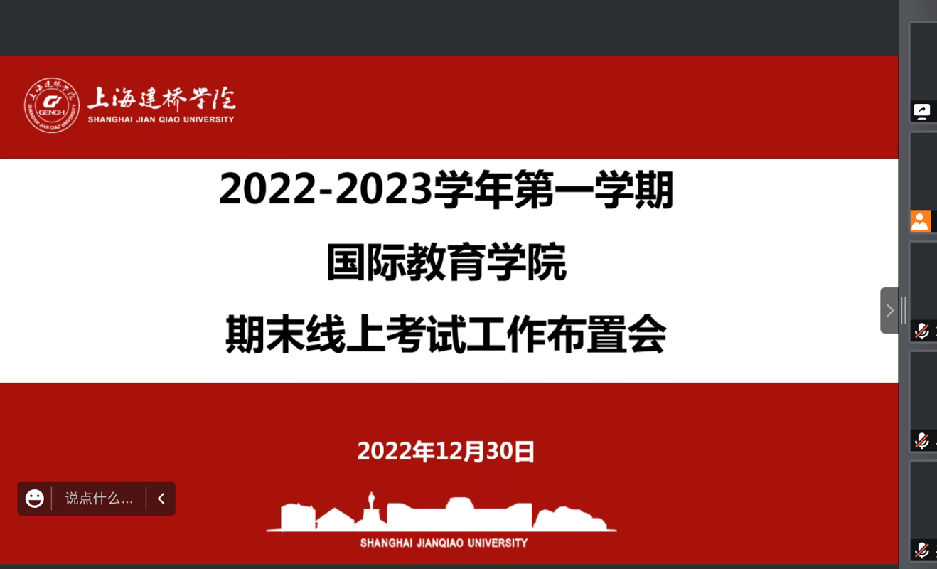 12月30日下午,国际教育学院面向全体专兼职教师、行政人员以及辅导员,召开了本学期线上期末考试安排说明会。会议由国际教育学院副院长刘潇滢主持。首先,刘潇滢副院长介绍了本学期国际教育学院期末考试方案,重点介绍了期末线上考试命题以及监考的相关事宜,提出本学期所有日语类课程线上期末考试统一采取“BB平台考试+腾讯会议监考”双平台的形式进行,专业类课程主要以“超星平台考试+腾讯会议监考”的方式进行。另外关于监考,国际教育学院也制定了线上考试细则和要求,确保各科目考试公正、公平、严格地进行。会上,刘潇滢副院长强调,任课教师需制定每门课程的线上考试通知,提前三天告知学生。同时要求各位辅导员对学生进行诚信考试教育,提醒学生考前注意事项。最后,刘潇滢院长提出要求,希望各位教师认真对待期末各项工作,把好本学期最后一道关。(供稿:国际教育学院)