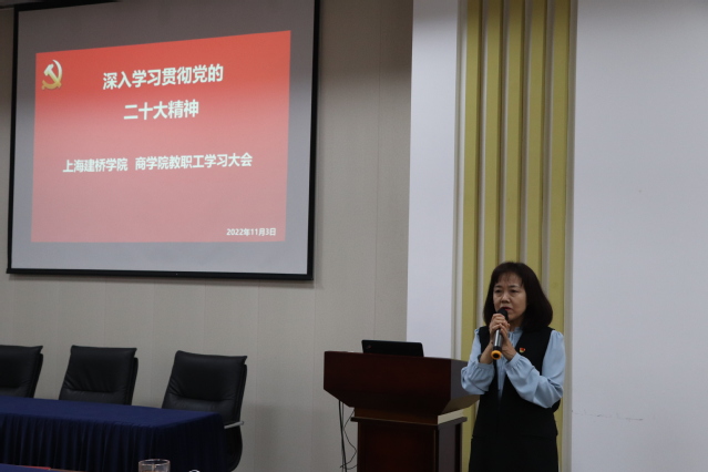 学习宣传贯彻党的二十大精神是当前和今后一个时期全党全国的首要政治任务。为全面学习把握落实党的二十大精神,引导广大教师原原本本学习研读党的二十大报告,认真领悟党的二十大提出的新思想新论断、作出的新部署新要求。近日,商学院组织召开全院教职工大会,并在上海建桥学院党的二十大精神理论宣讲团成员、商学院党委书记刘爱香的导读下集中学习党的二十大精神。刘书记从“学习宣传贯彻党的二十大精神的重大意义”;“全面准确学习领会党的二十大精神”;“认真做好党的二十大精神的学习宣传”;“坚持知行合一,贯彻落实好党的二十大作出的重大决策部署”以及“切实加强组织领导”等几个方面为广大教师深入总结和认真梳理了学习方向以及学习目标、重点任务以及重点要求。她讲到,广大教师要更加紧密地团结在以习近平同志为核心的党中央周围,高举中国特色社会主义伟大旗帜,坚定道路自信、理论自信、制度自信、文化自信,为全面建设社会主义现代化国家、全面推进中华民族伟大复兴而团结奋斗。她还讲到,广大教职工要深入学习和贯彻党的教育方针,认真总结二十大报告中关于教育的重要论述,要深刻明白不是为了“学”而学,而是为了“做”而学。会上,大家热情高涨、并纷纷