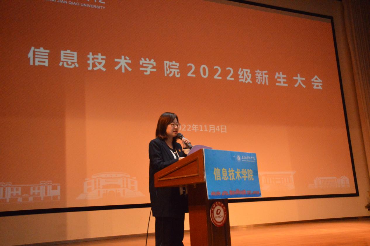 金桂飘香,秋风飒爽。11月4日,上海建桥学院信息技术学院2022级新生大会在学校大礼堂隆重召开。首先,党委书记王晨岑代表学院向来自各地的新同学致以热烈欢迎,并以习近平总书记在党的二十大报告中对青年的殷切寄语鼓励新生:“立志做有理想、敢担当、能吃苦、肯奋斗的新时代好青年,让青春在全面建设社会主义现代化国家的火热实践中绽放绚丽之花。”随后,矫桂娥副院长系统介绍了信息技术学院的历史发展及构架、基本情况及教学科研成果、实验室与实践基地、人才培养模式及成效。她表示,信息技术学院始终致力于构建创新创业教育与专业教育深度融合的人才培养新模式,以学生为主体,培养学生的综合能力。党委副书记徐娜对学生工作进行介绍,以五位一体联动,落实三全育人,鼓励新生以学院优秀毕业生为榜样,积极参加学院特色活动。并嘱咐学生做好防疫工作和安全教育,以严格管理,促学风建设。最后,郭天慧、李苗、郑丹萍、邢一铭、王雨、高智博老师细致地介绍了各自负责的横向工作,包括评奖评优、心理、文明修身、征兵、社区工作、团委学生会等,帮助新生熟悉大学生活,鼓励以积极的姿态融入大学生活中。最后,新生大会在掌声中圆满落幕,与会师生共同祝福2022级