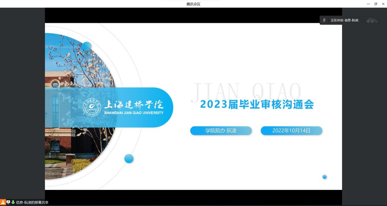 10月14日下午,信息技术学院召开了线上2023届毕业审核沟通会。19届全体辅导员及全体毕业班学生参加会议,会议由高智博老师主持。信息学院办公室阮凌老师根据学生学籍管理规定(2020年版),分别从学制与修业年限,成绩、学分与绩点,毕业、结业和肄业,学位授予,毕业及学位资格审核5个方面梳理了毕业审核的相关注意事项。另外,阮老师还以案例的形式,分享了往届毕业审核中的常见问题。强调同学们必须根据规定来审查自己是否满足毕业条件,并及时向辅导员和学院办公室反馈。最后,对于毕业班同学提出的毕业审核相关问题,阮凌老师进行了细致解答。本次会议的开展,使毕业班同学明确了毕业流程和审核方式,清晰了毕业审核的要求,保障了信息技术学院23届毕业生毕业相关工作的有序推进。