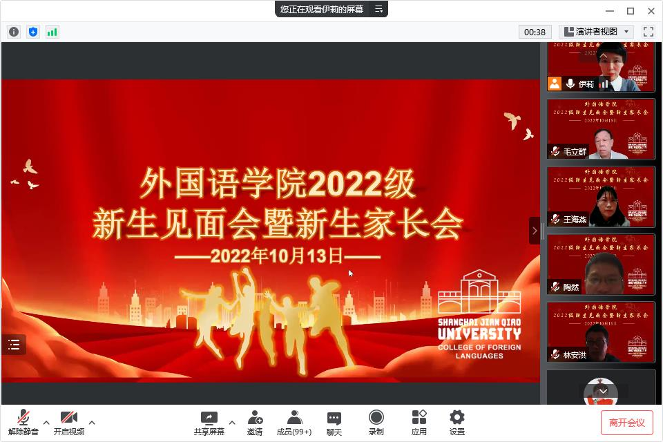 为了帮助新生更好地了解外国语学院,适应大学生活,同时加强家长与学院的互动,打造良好的家校联系网络,10月13日下午14:30,外国语学院于线上举行2022级新生见面会暨家长会。会议由党委副书记伊莉主持,外国语学院院长毛立群、党委书记杜鹃、副院长王海燕、各系部主任、辅导员、2022级新生及家长们通过腾讯会议的形式参加了本次见面会。会议伊始,主持人伊莉副书记首先代表学院对各位新生和家长表示欢迎和祝贺。院长毛立群从学院办学规模、专业设置、人才培养、就业率、考研升学等方面介绍了总体情况,让家长们对学校和学院有了大致的了解。他表示,来上海建桥学院是一个正确的选择,学校会不断调整和优化教学内容与要求,培养适应市场需求的人才,希望各位家长放心。党委书记杜鹃以“一本手册、两个目标、三支队伍、四条主线”为内容,深入浅出地讲解了外国语学院的学生管理制度。杜鹃书记对新同学提出了期望,她指出,同学们走进大学校园并不意味是终点站,而是迈入人生新篇章的一个新的起点,她希望同学们在大学努力奋斗,用青春热血,描绘一幅绚丽多彩的人生画卷。王海燕副院长介绍了学院发展沿革、学科设置、专业人才培养、学习资源与教学条件和师生风