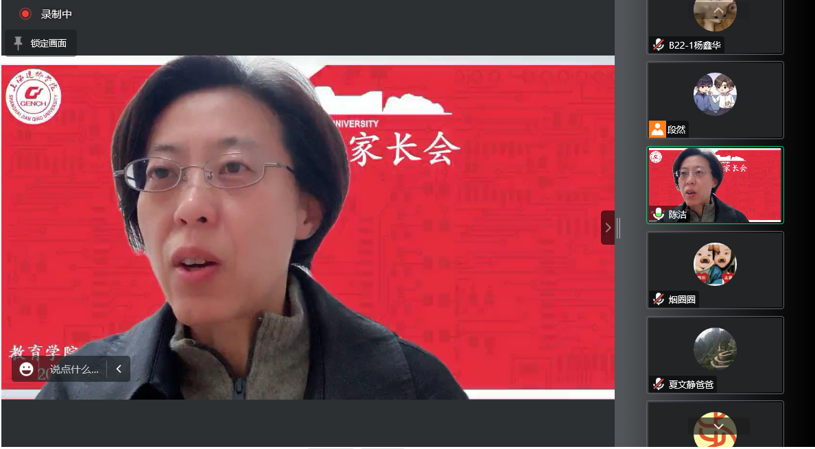 为了帮助新生更好地了解教育学院,了解学前教育专业,同时加强家长与学院的互动,建立良好的家校联系网络,10月11-13日晚上,教育学院于线上举行2022级院长、书记第一课和2022级新生家长会。会议由学院院长陈洁主持,教育学院党总支书记周荣玲、学前教育系系主任步社民、系副主任杨洁、学生工作负责人李奕璇、新生辅导员郭志娟、段然以及2022级的新生和家长们共同通过腾讯会议参加了会议。在院长、书记第一课上,陈洁院长以中国本科就业报告为切入点,细致的讲解了目前本科同学们的就业情况,并通过建桥学院的0BE课程改革为主题,深入探讨了建桥学院同学们的就业实力与竞争力,并为同学们送上了祝福。周荣玲书记则从学院培养计划开始讲解,向同学们介绍了学校的ISO9001质量管理体系以及学院培养计划和学分说明,并介绍了素质拓展相关内容。最后,院长、书记共同祝福各位同学能够拥有一个充实、完美、开心快乐、不断成长的大学生活。在新生家长会上,由院长陈洁代表学院向各位新生和家长表示欢迎和祝贺,教育学院学前教育系系主任步社民教授对学前教育专业做了清晰而细致的介绍,并从就业方向、培养目标、课程设置等方面多视角地指出了大学四年的