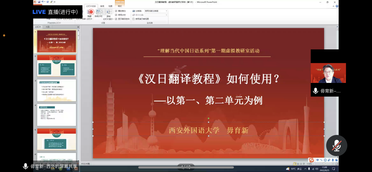 日前,高等学校“理解当代中国”系列教材共39册已正式出版,涵盖英语、俄语、德语、法语、西班牙语、阿拉伯语、日语、意大利语、葡萄牙语等9个外语语种及国际中文,于2022年秋季学期面向全国普通本科高校外国语言文学类专业本科生、研究生和语言类留学生推广使用。为帮助任课教师深入理解教材编写理念,准确把握教材核心内容,及时交流教材教学方法,高等学校“理解当代中国”系列教材虚拟教研室活动于2022年秋季学期启动。2022年9月25日(周日)上午10点,“理解当代中国”日语教材虚拟教研室活动第1期在腾讯会议上举行。《理解当代中国》日语系列教材总主编、天津外国语大学修刚教授担任牵头人,特邀《汉日翻译教程》副主编、西安外国语大学毋育新教授进行教学展示,结合《汉日翻译教程》第1单元和第2单元的具体内容,对翻译课程的教学设计思路进行了解说。上海建桥学院外国语学院日语系主任刘尔瑟、日语系教师李熙颖参加本次虚拟教研室活动,深入学习《理解当代中国》日语系列教材的内涵,明确了“三进”工作的重要战略意义,并参与了集体备课。外国语学院日语系将在本学期大四的《高级日语(2)》中融合使用《日语读写教程》,在大三的《笔译理论