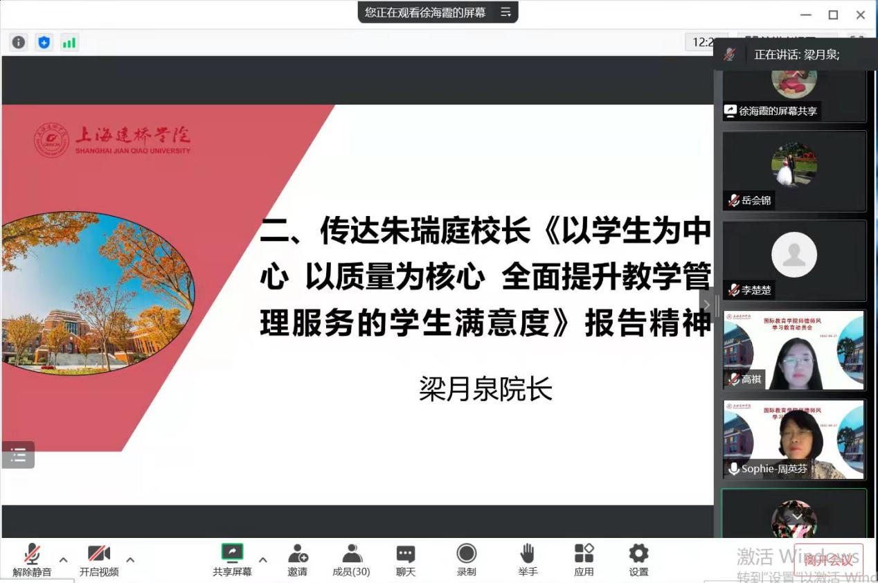 9月为学校师德师风建设月,结合我院师德师风建设月活动方案,学院在9月27日线上召开师德师风学习教育动员会,学院全体教职工参加会议,会议由学院党总支副书记高祺主持。会上,梁月泉院长传达了朱瑞庭校长《以学生为中心以质量为核心全面提升教学管理服务的学生满意度》的报告精神:办人民满意教育是我国高等教育的宗旨;高质量教育服务是高校的核心追求,学生满意度是高校的重要目标。学院要坚持以学生为中心,以质量为核心,围绕影响学生满意度的因素,改进学院各方面的工作,提高学生感知和体验到的教学管理服务质量。接着,周英芬书记详细介绍了《上海建桥学院师德师风建设月活动实施方案》和《国际教育学院2022年师德师风建设月活动实施方案》,强调学院深入开展师德师风建设的重要性和意义。随后,周英芬书记领学了《学习习近平总书记关于师德师风的重要论述》,引导广大教职工争做“四有”好老师,为培养德智体美劳全面发展的社会主义建设者和接班人贡献力量,以实际行动和优异的成绩迎接党的二十大胜利召开。为实现全员全过程全方位育人,推进学院构建“三位一体”育人模式,会上,学院为2022级7位新生专业导师颁发了聘书,希望教师们能够坚守立德树人初