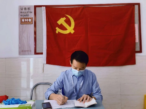 自3月份疫情发生以来,我校采用横向+纵向相结合的管理服务模式,横向是以学院为单位进行疫情防控和管控;纵向是以学生宿舍楼栋为单位开展网格化管理,每个楼栋成立网格化管理专班。作为南10楼栋专班成员,周博峰老师以身作则、率先垂范,以从严从实从细的工作态度,组建网格化管理小组机制队伍,实施楼栋精细化管理;作为6个班240名学生的辅导员,他细心关怀润物无声,用爱与温暖陪伴同学们一起抗击疫情。疾风骤雨砺初心自我校学生社区实施网格化管理以来,南10学生宿舍楼栋第一时间成立了楼栋工作专班,并组建了临时党支部。周博峰老师成为了南10楼栋专班组成员、加入了南十楼栋临时党支部,肩负起了南10男生宿舍的守护和管理责任。周老师总是冲在疫情防控第一线,主动承担最艰辛的任务。他先后从学生党员和入党积极分子中挑选出了12名责任心强、乐于奉献的学生骨干成立了防疫突击队,架构起了南10网格化管理体系,并带领队员们连续奋战,形成了以先进党员为标杆、气势高涨、勇于担当的抗疫氛围。周老师时刻为同学们着想,每当接到工作任务,他总是提前部署好,在志愿者还未来之前,总是第一个到达现场,开始工作准备。这一个多月以来,他常常都是一天吃两