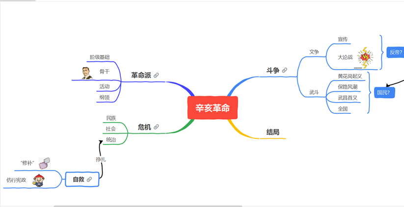 线下转为线上是授课方式的转变,同时也是教学工作创新的机遇。《中国近现代史纲要》课程的专任教师楚盛男老师立足于线上授课模式,将目前社会上十分流行的记忆思维工具——思维导图引入纲要课网络直播课堂,进行了教学技术层面的创新。楚盛男老师以思维导图对课本相关知识进行梳理为中心,将重难点内容的讲解课件融入思维导图中,进行着重讲解时立即调出,以详解、图片、视频加深同学们对基本知识的理解,同时对课本知识进行延申和补充,使教学内容逻辑关系清晰可见,重难点一目了然。上课导图另外,楚盛男老师将专题中的某些具体问题布置给相应学习小组,由学生制作思维导图并进行在线讲解展示,此项活动督促了学生将有关知识按照思维规律进行整理,提高了学生学习的深入程度及学生的思辨能力。同时,将学生制作的优秀的思维导图组合进相关专题的导图之中,激发了学生学习的积极性。学生导图汇报就目前教学实践可以看出,楚盛男老师的思维导图教学取得了很好的效果。学生通过使用思维导图这一思维工具中的“瑞士军刀”,培养了系统性思考的能力,并且从总体上把握了课堂知识,由对知识点的学习转向对知识逻辑线索的掌握。思维导图更易突出重难点,不易淹没于对历史细节的描述