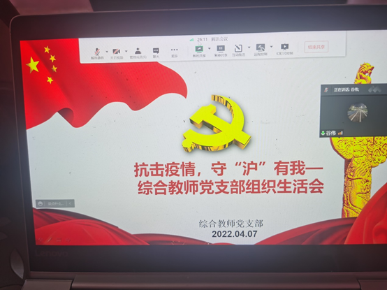 当前,上海新冠肺炎疫情处于高位流行,在党中央和上海市委市政府的领导下,各项防控措施在有力推进。 为推动在疫情防控期间“不忘初心、牢记使命”主题教育的深化学习,充分发挥基层党支部战斗堡垒作用及党员先锋模范作用,综合教师党支部于4月7日组织支部全体党员开展“抗击疫情、守“沪”有我”的线上专题组织生活会。综合教师党支部书记臧玉洁带领全体党员在学习强国平台上学习了《致全市共产党员的公开信》和人民日报4月7日《坚定信信心,坚持就是胜利》的发文。臧玉洁书记指出,当前上海疫情防控形势严峻,作为党员教师要“亮身份,见行动”,要“深入基层,深入群众”,要坚守教师岗位,不光要做好线上教学工作,还要主动关心学生的生活,及时帮助学生解决困难。党员要主动向社区报道,主动承担社区防控责任,积极投入到社区的志愿者工作中,发挥党员的模范带头作用。党员要“发出好声音,传播正能量”,坚定信心,排除万难,为打赢这场硬仗贡献自己的力量。与会教师党员们围绕网络教学、课程思政、就业指导及社区志愿者工作等工作进行深入讨论。作为综合教师党支部的一员, 职业技术学院院长谷伟在第一时间报名了社区志愿者工作,在核酸检测,维持秩序等工作中发
