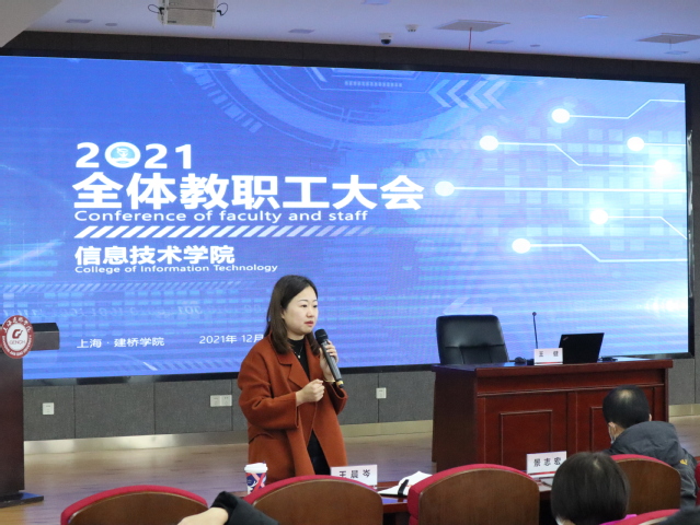1111MicrosoftInternetExplorer402DocumentNotSpecified7.8 磅Normal02021年12月16日下午,信息技术学院在珠宝学院4楼报告厅召开全体教职工大会。学院党委书记王晨岑、副院长矫桂娥、党委副书记徐娜、院长助理景志宏、学院办公室主任蒋玮荻出席,全体教师参加会议。会议由王晨岑主持。会上,矫桂娥副院长对期末阶段教学工作提出了三点要求。一是严抓学风建设,继续落实“沉浸式课堂师生课堂规范实施方案”各项要求,不断提高课堂质量;二是做好期末各类材料归档工作和评教工作,要求各位老师要认真负责,及时提交期末归档材料,同时完成教师评学并提醒学生完成评教工作:三是重视四、六级监考和期末监考工作,强调各位老师要按时到岗,认真监考,避免出现各类教学事故。其次,蒋玮荻主任介绍了近期工会的各项工作。蒋主任传达了校工会关于“一日捐”的会议精神,倡议各位老师学习“雷锋精神”,甘于奉献,鼓励各位老师在自愿的原则下进行捐款,努力帮助有需要的人;同时,蒋主任提醒各位老师,在疫情期间,做好防疫工作,共同筑好防疫战线。最后,王晨岑书记作总结发言。王书记指出,全体教师要遵守