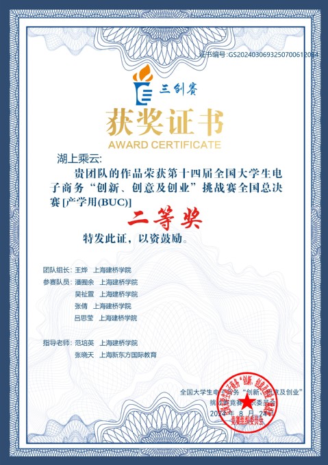在激烈的全国角逐中,湖上乘云团队凭借其创新的电子商务项目,在第十四届全国大学生电子商务“创新、创意及创业”挑战赛全国总决赛中荣获二等奖,为上海市代表队增添了光彩。自市赛获得上海市级一等奖后,湖上乘云团队继续优化其项目,进一步深化电子商务与创新创意的结合。在全国赛中,团队展示了一个创新性强、市场前景广阔的商业模式,受到了评审专家的一致好评。湖上乘云团队的项目不仅具备了深刻的市场洞察力,还展现了精准的商业逻辑与可持续发展潜力,尤其在创意性与应用的结合上表现突出,成功吸引了各方关注。“能够在全国赛中获得二等奖,我们感到非常自豪。”团队成员表示,“这是对我们长期努力与团队合作的认可,也激励我们继续精进项目,以期在未来的商业竞争中取得更大成就。” 湖上乘云团队始终秉承创新驱动的理念,将创意与市场需求紧密结合,致力于为消费者和企业提供更加高效的电商解决方案。本次全国赛汇聚了来自全国各大高校的顶尖电子商务创意项目,经过激烈角逐,湖上乘云团队最终凭借其独特的商业模式和创新的思维,成功获得了二等奖。这一成绩不仅是对团队创新能力的充分肯定,也为团队在未来的行业发展中奠定了更加坚实的基础。未来,湖上乘云团队