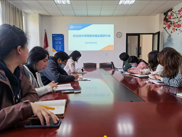 3月25日上午,职业技术学院学工团队在247会议室召开防诈骗主题研讨会。学院党委副书记潘明芸出席,全体辅导员参加,会议由18级辅导员廖艺晗进行主持。会上学院法制宣传教育负责人廖艺晗向各位老师传达学校会议精神,并向各位老师简单介绍电信网络诈骗的发案特点以及其防范要点,以便各位老师开展防诈骗安全教育工作,提高学生的防范意识,以期降低学生受骗受害的风险,更好地保障个人的人身财产安全。学院党委副书记潘明芸强调,各位老师根据会议精神,在班级中开展防范电信网络诈骗安全教育工作,更好的落实会议精神,做到防诈骗主题教育常态化,尽所能维护好学生的身心安全。