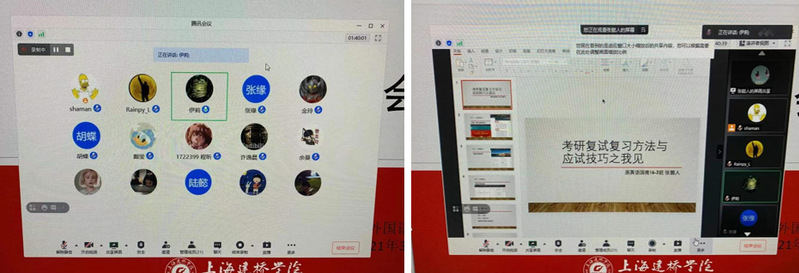 为增强考研学生面试的信心,做好考研复试的准备,搭建考研信息交流平台。3月21日下午,外国语学院举办了线上考研复试分享会。学院党委副书记伊莉老师 、大四辅导员、3位优秀校友及17级考研通过国家线的同学参加了此次分享会。此次分享会主要分为学长学姐经验交流、辅导员老师经验分享、答疑解惑、总结发言四个环节。考取上海外国语大学硕士研究生的15级校友邬建佳从复试政审准备和面试准备两个大方面做了分享,指出政审材料要准备充分,注意各种时间节点,不要因为操作失误错失面试机会,同时提出面试时候的综合能力很重要,线上面试着装和体态的注意事项。考取广东财经大学的16级校友张懿人同学从信息检索、有效复试技巧、导师选择、复试内容及面试技巧等四方面结合自身经历为同学们分享经验。考取青海师范大学的16级校友朱笑同学主要从地域选择、专业课及面试注意事项三方面进行分享。朱笑同学建议同学不要局限于高竞争力的地域,西北东北其实也是选择。紧接着刘沛雨老师结合大家的分享对考研复试给出了更加明确的指导,希望同学们合理安排好时间,绝不松懈,保持奋斗状态至拿到录通知书的那一刻。随后,学生根据自身的需求进行提问,参会的老师学长学姐积极答