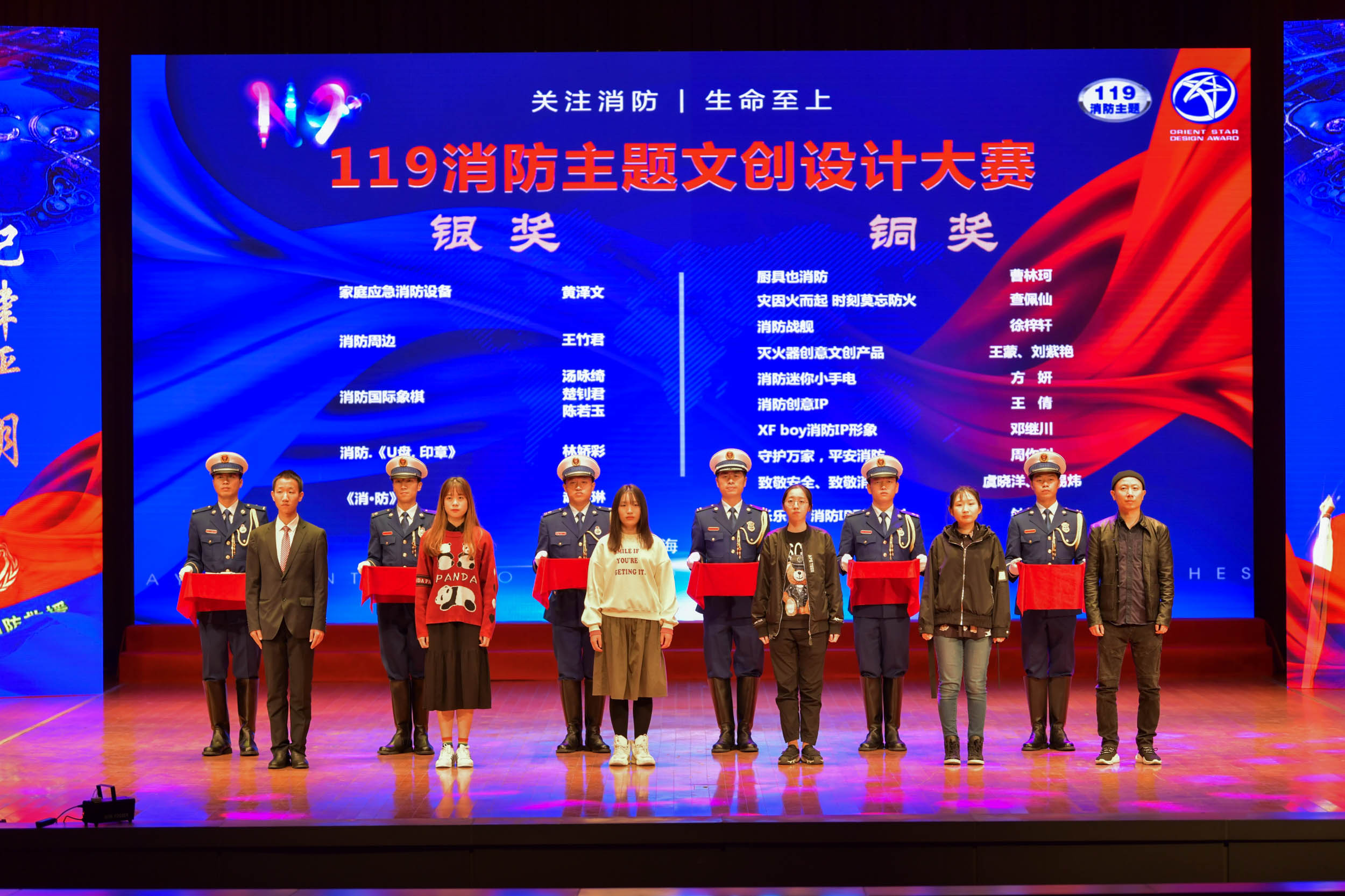 本届大赛作为东方创意之星设计大赛专项设计赛,由上海市文化创意产业推进领导小组办公室、上海市科技艺术教育中心作为指导单位,东方创意之星设计大赛组委会、上海市奉贤区消防救援支队主办,术界创e园、耘耕文创平台承办,上海术界文化发展有限公司、原境文创定制供应平台、上海文燮文化传播有限公司协办。艺术设计学院院长葛洪波亲自带队,院长助理叶明伟、视觉传达系主任汤美娜作为指导教师,组织学生仅在7日内完成竞赛作品设计并提交,11月5日大赛公示获奖名单,获一项铜奖、八项优秀奖、十四项入围奖,产品设计B18-7曹林珂同学获铜奖,叶明伟老师获优秀指导教师奖,上海建桥学院艺术设计学院获优秀组织奖。12月获等级奖学生及优秀指导教师受邀赴现场颁奖。