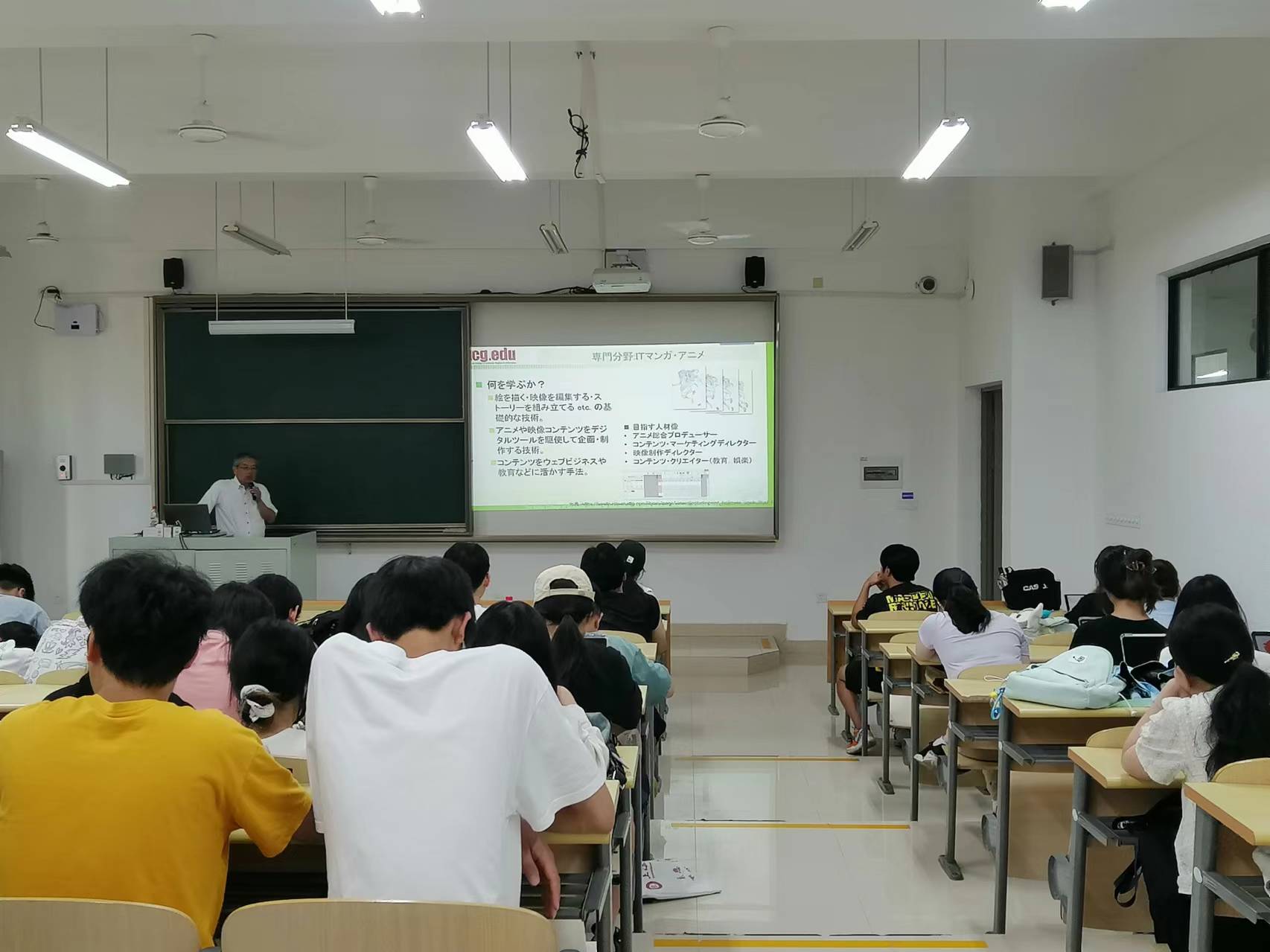 为促进国际教育学院中日合作项目各专业学生了解日本文化艺术,开拓国际视野,国际教育学院特邀请3+2留学项目的合作学校——日本京都情报大学院大学教授为学生开展系列讲座。2024年9月9日上午,京都情报大学院大学植田浩司教授开讲,题为《漫画动漫与音乐》。为满足各专业学生,此讲座共举办3场,国际教育学院中日合作项目22级本、专科5个专业的全体学生参加了讲座。植田老师通过引入同学们熟知的《咒术回战》、《间谍过家家》等作品,介绍了漫画及动漫在传播平台、放送时间及受众对象等方面的特征和变化,并通过展示丰田、斯巴鲁等车企、学校和新干线的广告、产品包装及动漫主题活动等,从多角度呈现了动漫的商业应用。此外还对京都情报大学院大学IT漫画动漫专业及其授课教师进行了详细介绍,并运用图片和视频等形象地讲解了动漫制作技术、动漫音乐等内容。以本次讲座为契机,学生们丰富了动漫在制作技术及商业应用上的知识,特别是对有赴日留学计划的学生而言,对在日就读专业有了更具象化的认识,为其今后的学习起到了很大帮助。图1 植田浩司教授为国际教育学院学生讲解动漫制作相关知识图2 植田浩司教授解答同学们的问题(撰稿:魏嘉敏)