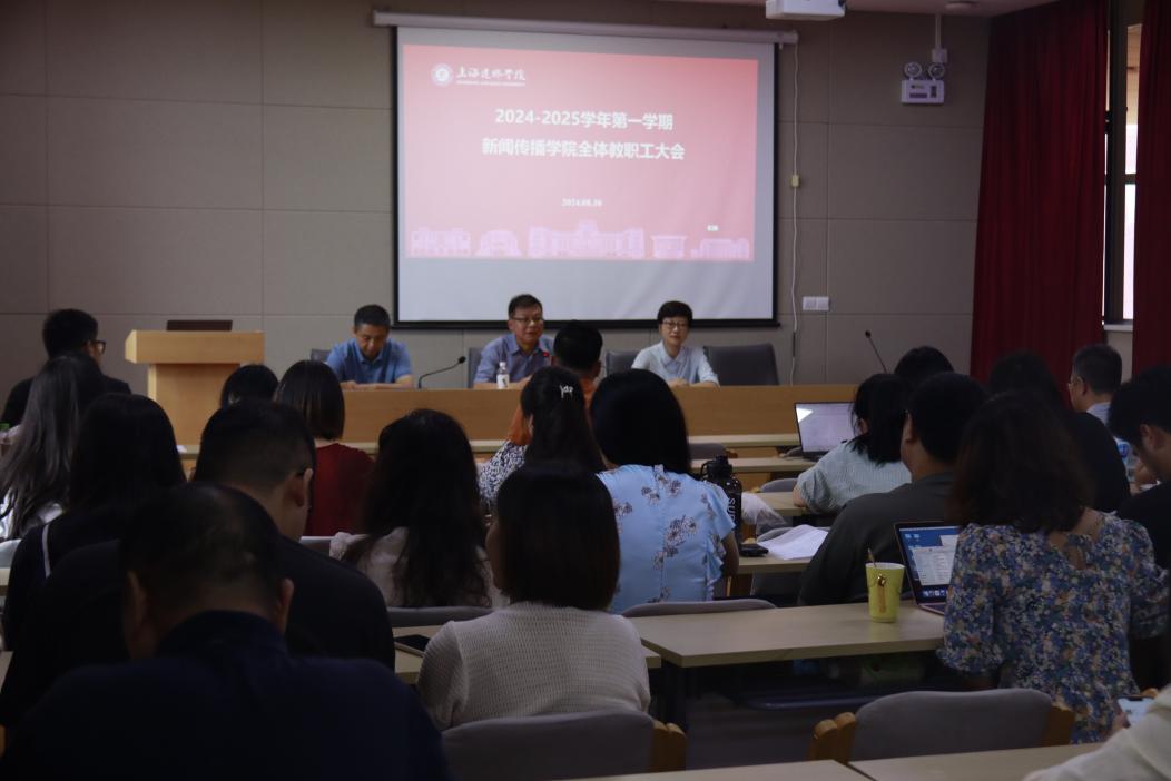 为做好新学期工作安排与重点工作部署,推动各项工作的顺利开展。8月30日,新闻传播学院在学院楼308,召开全体教职工会议。会议首先,由各系部介绍本学期新进教师。接着,新闻传播学院党委书记徐磊教授开场讲话。徐磊书记对整个暑假期间,各位老师在就业、招生、培训、教学、科研、学生管理等多方面的辛勤工作表示肯定。在全院集体的辛苦努力之下,学院顺利完成今年的招生与就业目标。同时徐磊书记传达8月29日全校中层干部会议精神,详细介绍了学校新一轮综合改革的目标与情况等,学院层面需要认真贯彻落实,二级学院增强主体性建设,提升管理效能,增强学院发展动力,推动高质量发展。教学院长张建民,结合学校教学会议等系列要求,针对新学期教学工作,从“新进教师管理”、“开学第一周教学管理”、“教师教学注意事项”、“2025届毕业生就业筹备”、“学生学业预警工作”、“云教学中心”等系列工作,全面做好教学工作的安排部署。最后,郑涵院长总结讲话。郑涵院长以“10月份教育部督导督察”、“2025年4月分类审核评估”、“2026年新闻与传播专业硕士研究生学位点申报”三个重要时间节点,以“目标导向、问题导向、成果导向”为原则,着重做好学