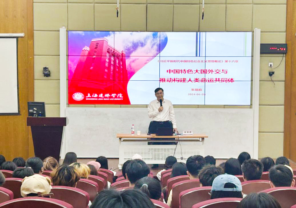 2024年6月5日晚上,上海建桥学院校长朱瑞庭教授在三教222教室为我校学生讲授《习近平新时代中国特色社会主义思想概论》课程第十六章《中国特色大国外交和推动构建人类命运共同体》,马克思主义学院院长宋艳华主持此次授课。朱校长视野宏阔、造诣深厚,以深厚的理论功底、扎实的专业素养,旁征博引向学生分享了自己对中国特色的大国外交和推动人类命运共同体的深刻思考,朱校长重点从“世界怎么了”、“人类向何处去”、“中国怎么办”三个方面进行了深入的阐释,对世界百年未有之大变局做出全景式呈现,讲述了构建人类命运共同体的理论依据、丰富内涵和实践要求,强调这是中国为解决人类社会普遍问题贡献的“中国方案”。朱校长的授课既有令人折服的理论分析,又有恰当精彩的案例引入,对中国如何履行大国责任,推动构建人类命运共同体作了系统、深刻的阐述,是一场丰盛的理论大餐。朱校长在授课中,与同学们一起,深入学习、领悟习近平总书记对思政课建设所作的重要指示,对大学生成长成才的殷殷嘱托。希望学生能立足于培养目标,做好学业规划,不断提高自身的综合素质,练就品德修养、自主学习、表达沟通等八大核心素养,努力使自己成为高素质、应用技术型人才。听