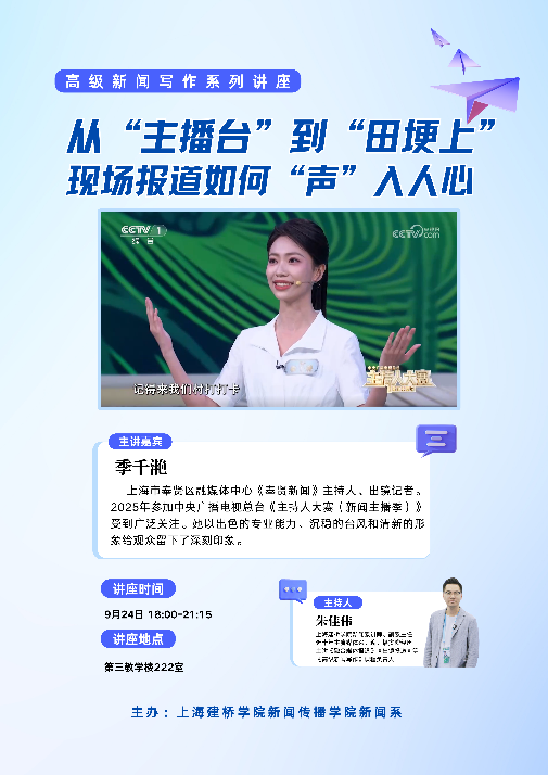 9月24日晚,上海建桥学院新闻系主办的“专业报道系列讲座”迎来第三讲。奉贤区融媒体中心新闻主播、出镜记者季千滟受邀走进校园,以“现场报道如何‘声’入人心”为主题,结合丰富的实战案例和2025年中央广播电视总台《主持人大赛·新闻主播季》的参赛经历,为同学们带来了一场内容扎实、互动热烈的专业分享。本次讲座由新闻系副系主任朱佳伟老师主持。三大“锦囊”,直击现场报道核心讲座中,季千滟从即兴表达、细节挖掘、语言审美三个关键维度,分享了她的现场报道“实战锦囊”。 她首先指出,即兴表达的关键在于放下“完美焦虑”,真实感比流畅度更重要。她结合自身经历和央视主持人大赛经验,鼓励同学们接纳表达中的不完美,灵活捕捉现场核心信息,用自然的状态传递真实感受。其次,她强调细节捕捉对于现场报道的关键作用。记者需充分调动“五感”,细致观察、主动提问、用心感受,才能挖掘出有深度、有温度的报道内容。她通过生动的案例说明,一个被追问的细节往往能让报道立意升华。关于语言审美,季千滟建议同学们找准个人风格,拒绝千篇一律的模仿。她认为,无论是沉稳平实还是活泼生动,只有适合自己的表达方式才能形成独特魅力,让观众记得住。实战互动:在