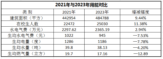 围绕绿色低碳和降本增效双向发力,进一步深化美丽绿色校园建设,让学校成为实践双碳战略的引领者;进一步加强宣传培训和教育引导,让广大师生自觉成为低碳生活的先行者;进一步加强节能改造和节能技术推广,让学校成为节能环保的实践者。学校生均能耗较2021年下降1.5%(2022年因疫情,没有可比性)。自2024年1月15日学校成立能源管理办公室以来,虽然时间不长,但做了大量工作,也取得很大成效。由能源办牵头拟定,经校长办公会审议通过了《上海建桥学院低碳发展行动方案》、2024年能源管理重点工作及资金预算。1.建章立制、明确职责、规范管理。能源办梳理制定了《能源管理办公室职责》《能源和水资源管理办法》《水电收费管理办法》《水电气使用操作细则》等规章制度,并纳入学校ISO质量体系管控。2.加强管理 形成合力。成立了由各二级学院部门36为教职工组成的能源管理督导员队伍,制定能源管理督导员职责,实行能源属地化网格化管理。实现学校所有使用单位能源管理全覆盖,积极开展全校低碳建设,加强各单位节能意识。落实二级单位(部门)用能主体责任,发挥能源督导员作用,提高能源管理精细化水平。激发二级单位(部门)参与低碳建设