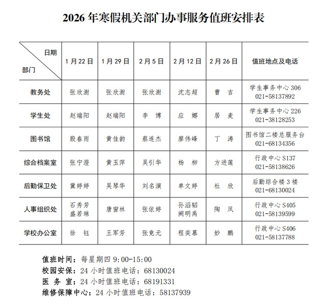 上建桥院办〔2026〕1号各二级学院、部门,有关单位:根据《上海建桥学院2025-2026学年校历》,经研究,现将2026年寒假安排通知如下:一、学生放假安排寒假时间为2026年1月19日至3月6日。全体学生应于3月7日至8日返校报到,3月9日起正式上课。二、教职工轮休安排1. 教职工在完成本学期教育教学任务及本单位相关工作安排并确保假期工作正常运行的前提下,可从1月19日起,由所在单位根据实际情况统筹安排轮休。对于在本学期监考、休息日教学与管理服务等工作中表现突出的教职工,各单位可根据实际予以优先安排调休或调补。2. 全体机关及行政人员3月5日起正常上班;全体教师3月6日起正常上班,并开展新学期教研活动。3. 教职工通勤班车自1月19日起停运,3月5日起恢复运行。三、相关工作要求1. 寒假期间,各级干部要确保通信畅通,相关岗位应认真落实值班备勤,加强应急值守;各服务窗口要妥善安排好假期基本的办事服务,及时处理有关公务和师生事务。后勤、运维保障等服务部门的放假调休安排根据实际另行规定。2. 各二级学院应利用假期积极组织走访企业,深化“一院一策”综合改革方案和人才培养方案;各部门要利用假