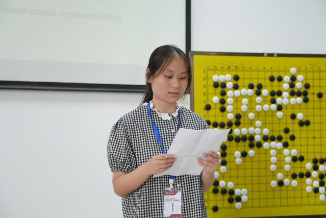 优秀助理教练员代表黄少君分享了她的工作感悟,除了自身提高工作能力和突发事件应对能力外,国际学员们展现出对围棋的热爱令她印象深刻。学员在课外和外出体验活动中依旧不断专研围棋,几位助理教练员从学员身上学到对热爱和专注围棋的态度。围棋作为一条文化的纽带,连结起不同国家的学员们的友谊。