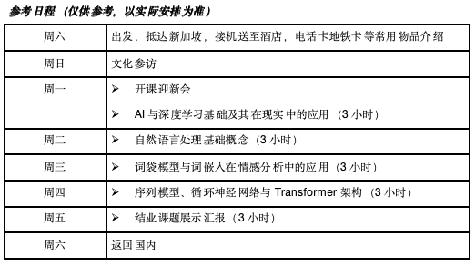 课程内容包括:AI与深度学习基础及其在现实中的应用、自然语言处理基础概念、词袋模型与词嵌入在情感分析中的应用等。