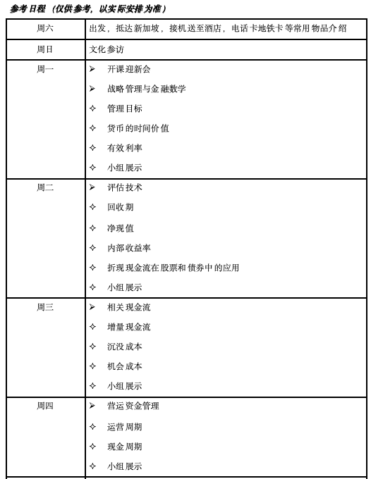 课程内容包括:评估技术、相关现金流、营运资金管理、公司财务分析等。