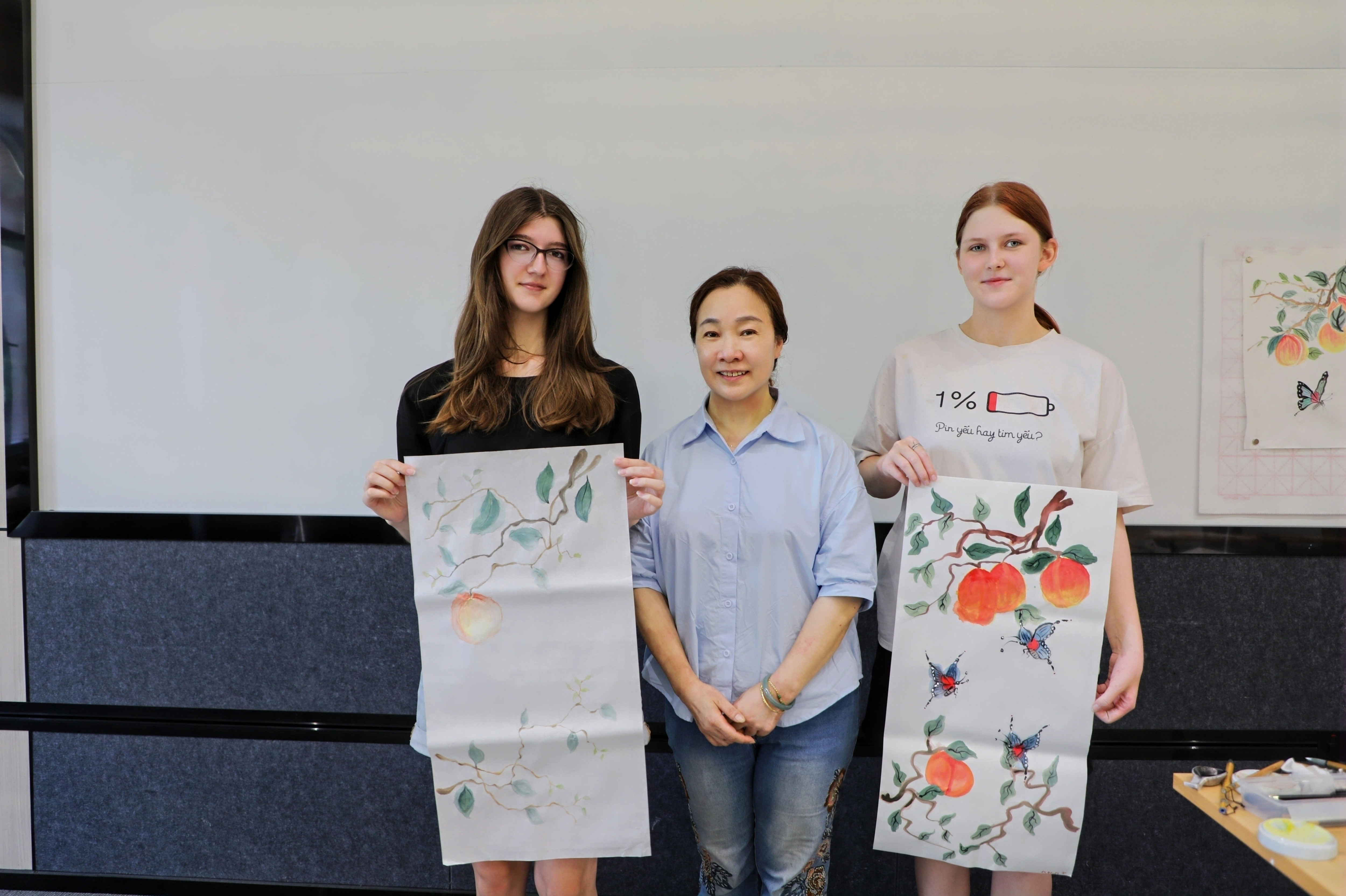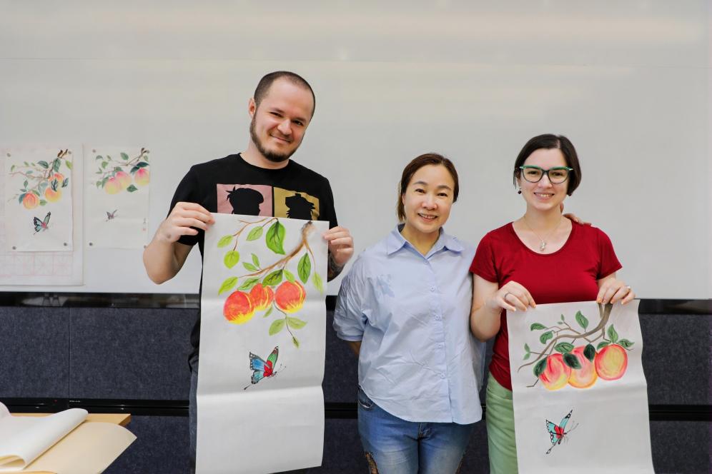 袁蓓老师以中国国画入手,学习水墨和颜料创作,注重意境和气韵表达。描绘自然景物的过程中,学员们用简约的线条、大块的透亮彩墨描绘夏日盛开的荷花,用柔和的调色画出夏季蔬果“水蜜桃”,接触到中国画特有学习用具的学员们表示很新奇,深刻体验中国书画魅力的同时,对于自己运用独特的绘画方式创作的成果也倍感自豪。后续课程将进行文创绘画,让学员们将心灵融入到书画艺术之中,感受中华传统文化的瑰宝。