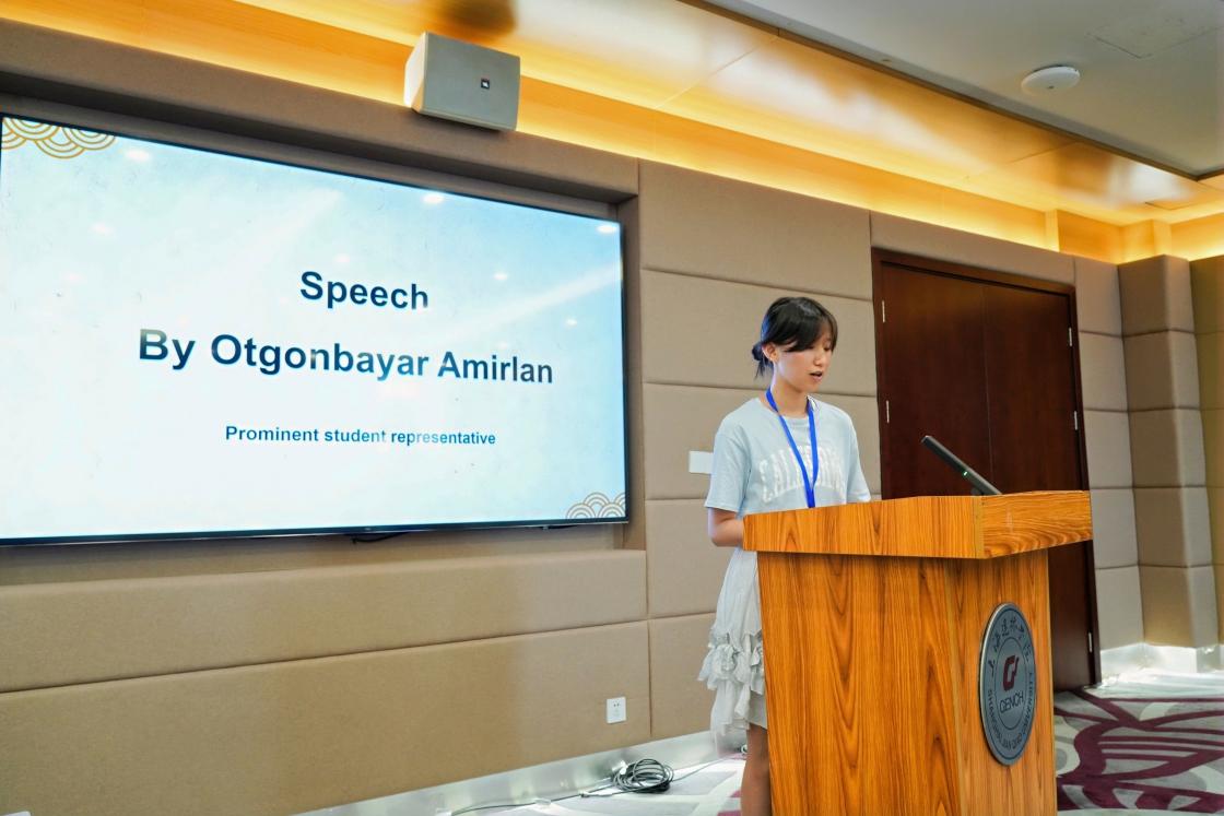 优秀学员代表Otgonbayar Amirlan提到相比中国和俄罗斯而言,蒙古围棋爱好者数量较少,但他们时常关注与围棋相关的活动。此次是她第一次来到中国,游览之际她惊叹上海建筑的壮丽与奇特。她很感谢今年能有机会参与中国围棋班拓展知识和经验,生动有趣的汉语课和书画课使她深深爱上了这里,希望未来自己能作为国际学生到建桥学习。