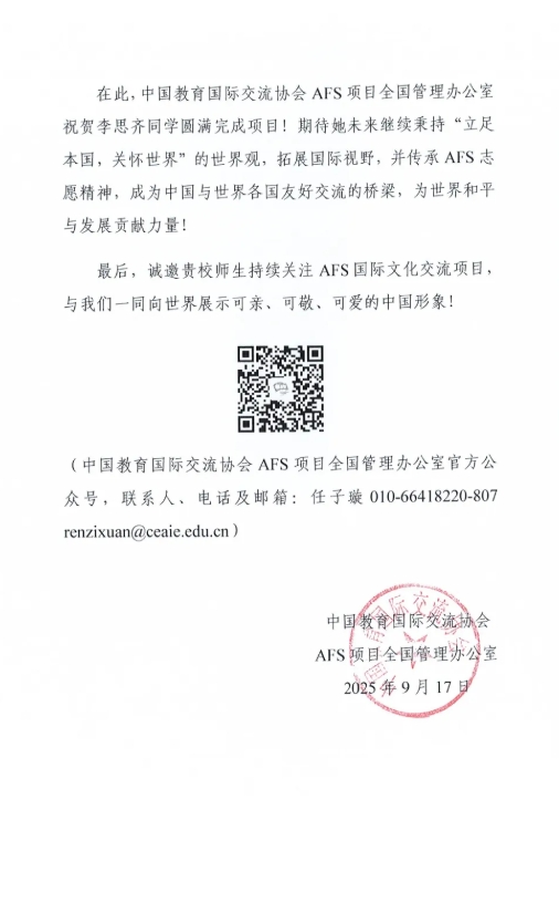 2025年9月,我校对外交流办公室收到了中国教育国际交流协会AFS项目全国管理办公室的来信。
