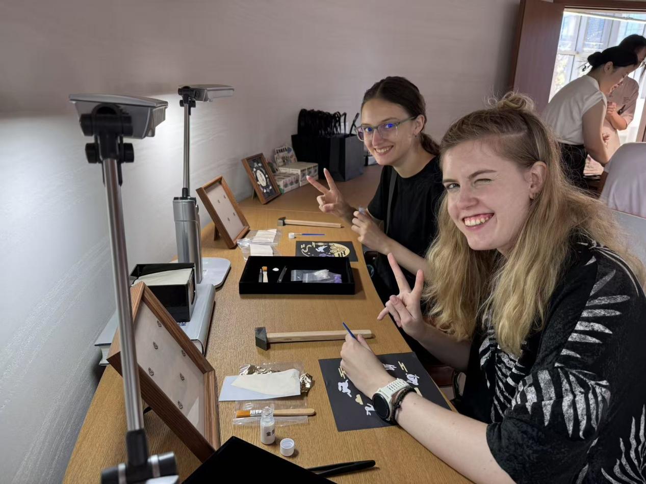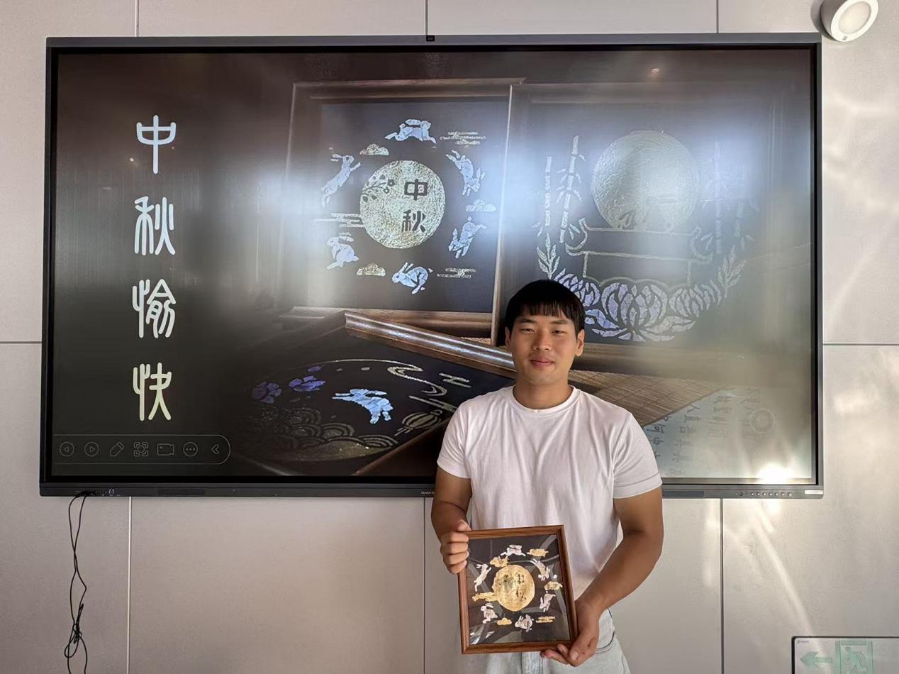 紧接着,进入手作环节,师生可自选三个中秋主题:“群兔拜月”以玉兔祈愿传说为灵感,用白螺片表现兔毛、金箔点染月光,呼应团圆祝福;“檐上观月”刻画兔子坐屋檐望月之景,以屋檐喻家,配莲花纹样添东方韵味;“跃兔祥云” 展现兔跃祥云的动感,圆形外框象征圆满。师生专注创作,每一份手作里的螺钿都映出彩虹光泽,金箔如月光闪耀,尽显巧妙构思。活动尾声,师生们同举作品预祝彼此“中秋快乐”,来自俄罗斯的国际学生们表示不仅收获了专属艺术品,更触摸到中华文化的温度。
