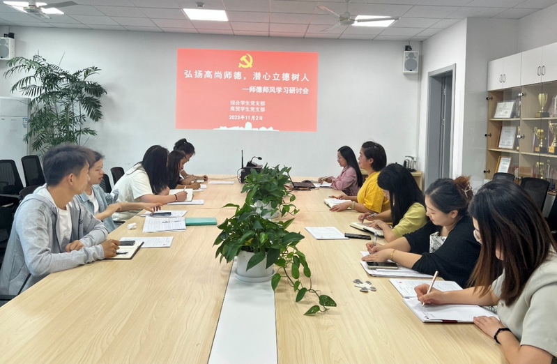 11月2日下午,职业技术学院外语学生党支部、综合学生党支部在会议室419联合开展“弘扬高尚师德,潜心立德树人”师德师风学习研讨会,本次会议由组织委员廖艺晗老师主持,学院党委副书记马冯莉以及两个学生党支部全体老师参加。